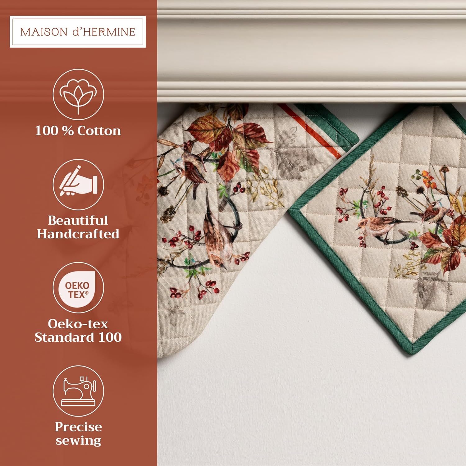 Maison d' Hermine 100% Cotton Oven Mitt & Pot Holder Set (7.5"x13" & 8"x8") Heat Resistant BBQ Cooking Gloves with Loop, Baking, Grilling, Kitchen, Handling Hot Pans (Recolte)