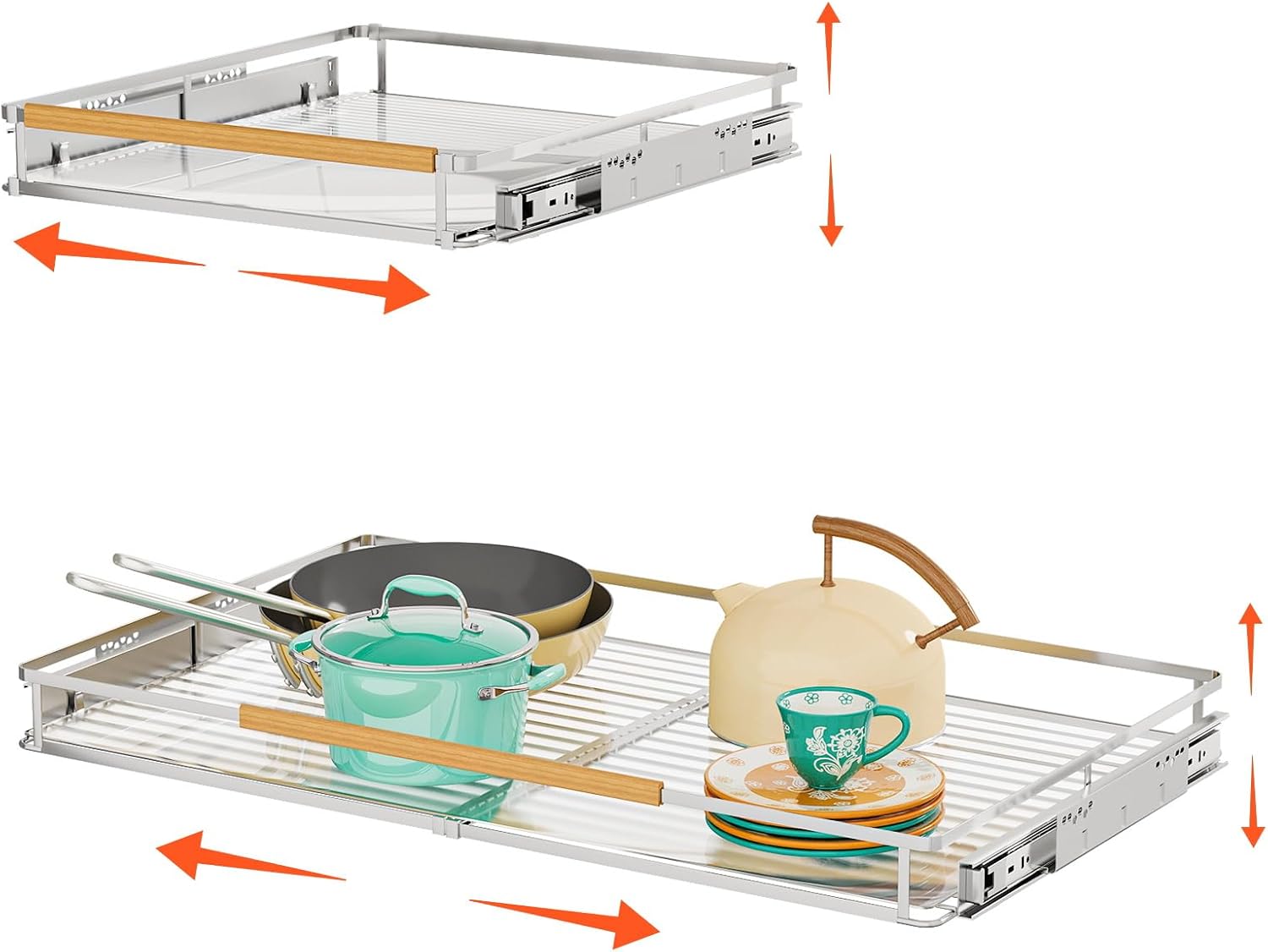 - High Quality Stainless Steel: This pull-out storage shelf is made of high quality stainless steel, the overall look is sturdy and stable, with a bright color that doesn't rust easily, load-bearing capacity up to 110b. Ideal for your kitchen, bathroom, under sink, wardrobe and pantry storage organizing.
