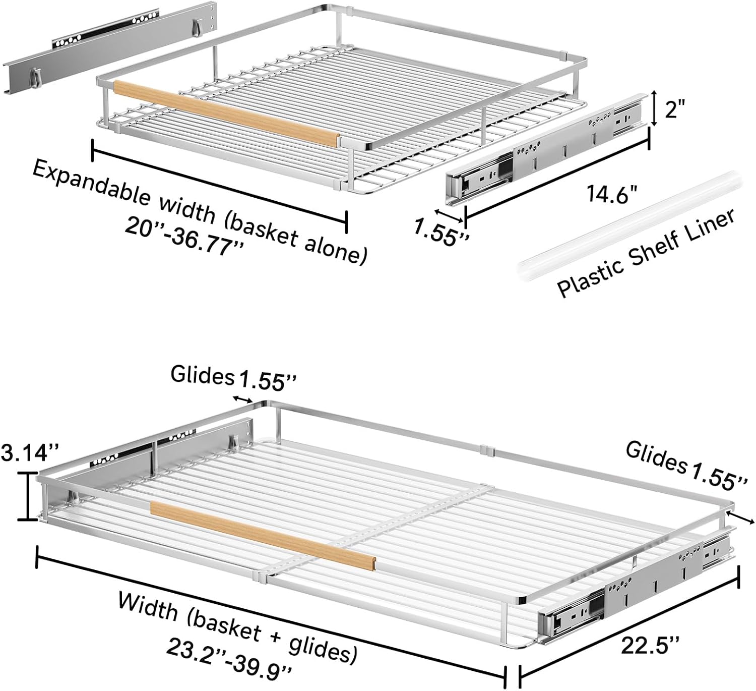 - Upgraded Expandable Design: This pull out cabinet shelf is designed to fit in most cabinets. The width of the wire basket can be adjusted from 23.2'' to 39.9''. Unlike the traditional bottom-mounted pull out cabinet organizer, our pull out cabinet organizer can not only expandable but also adjust the height to be installed on the side, not only at the bottom. The new expandable design gives you a better experience and saves your space.