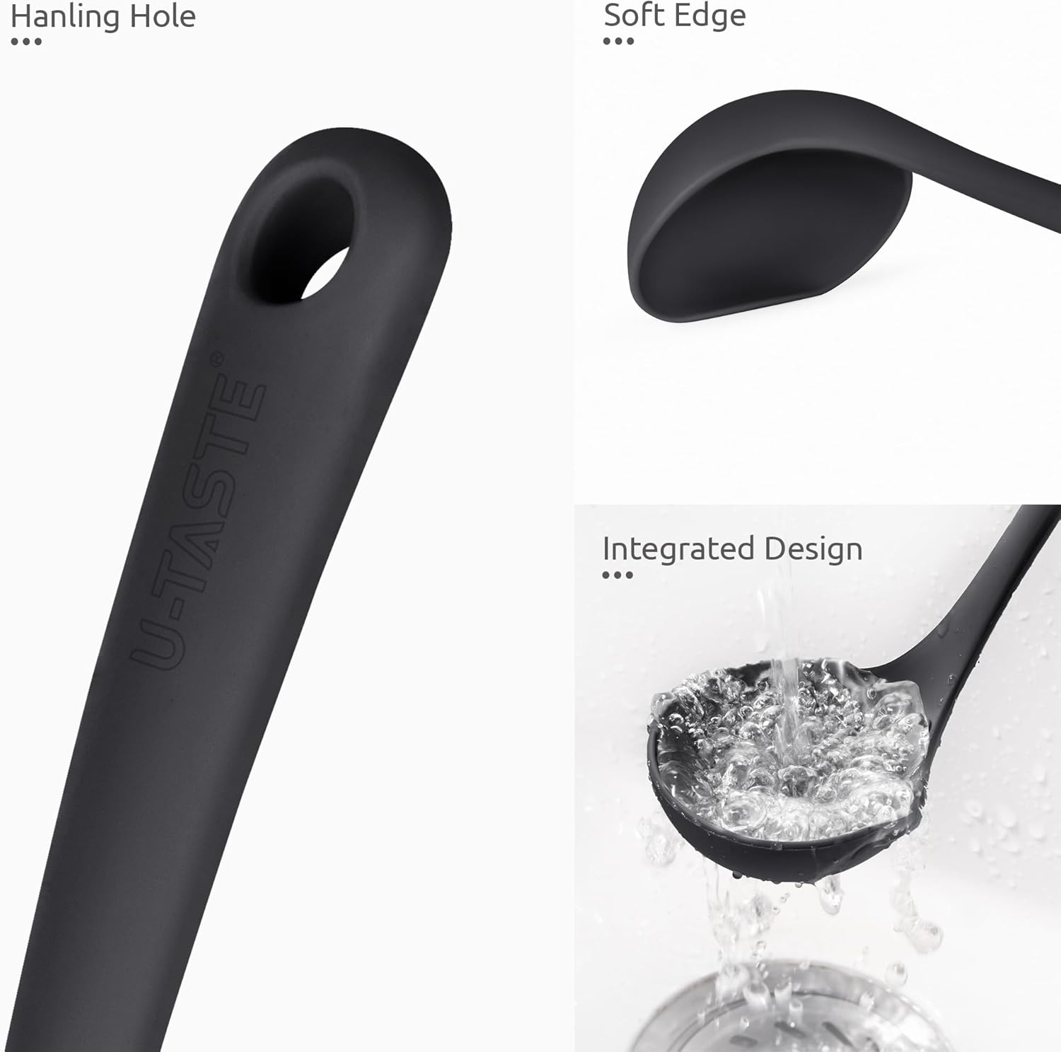 2.6oz Small Silicone Soup Ladle: U-Taste 600ºF Heat Resistant Non-Stick Kitchen Deep Serving Spoon, Soft Cooking Utensil with Non-Slip Solid Handle for Mixing Sauce Stew Gravy (11in, Black)