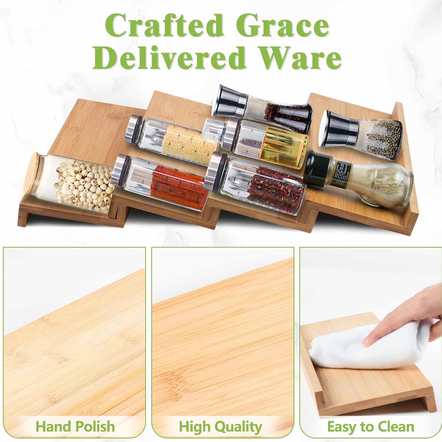 - Crafted Grace, Delivered Ware: Transform your kitchen with the Graceware bamboo spice rack drawer organizer. Designed with elegance and efficiency in mind, this kitchen organizers and storage will effortlessly tidy up your drawers. Its minimalist design ensures that your kitchen drawer organizer is space-saving and functional, maximizing accessibility. A must-have for every kitchen, the Graceware spice rack organizer for cabinet is the blend of beauty and practicality.
