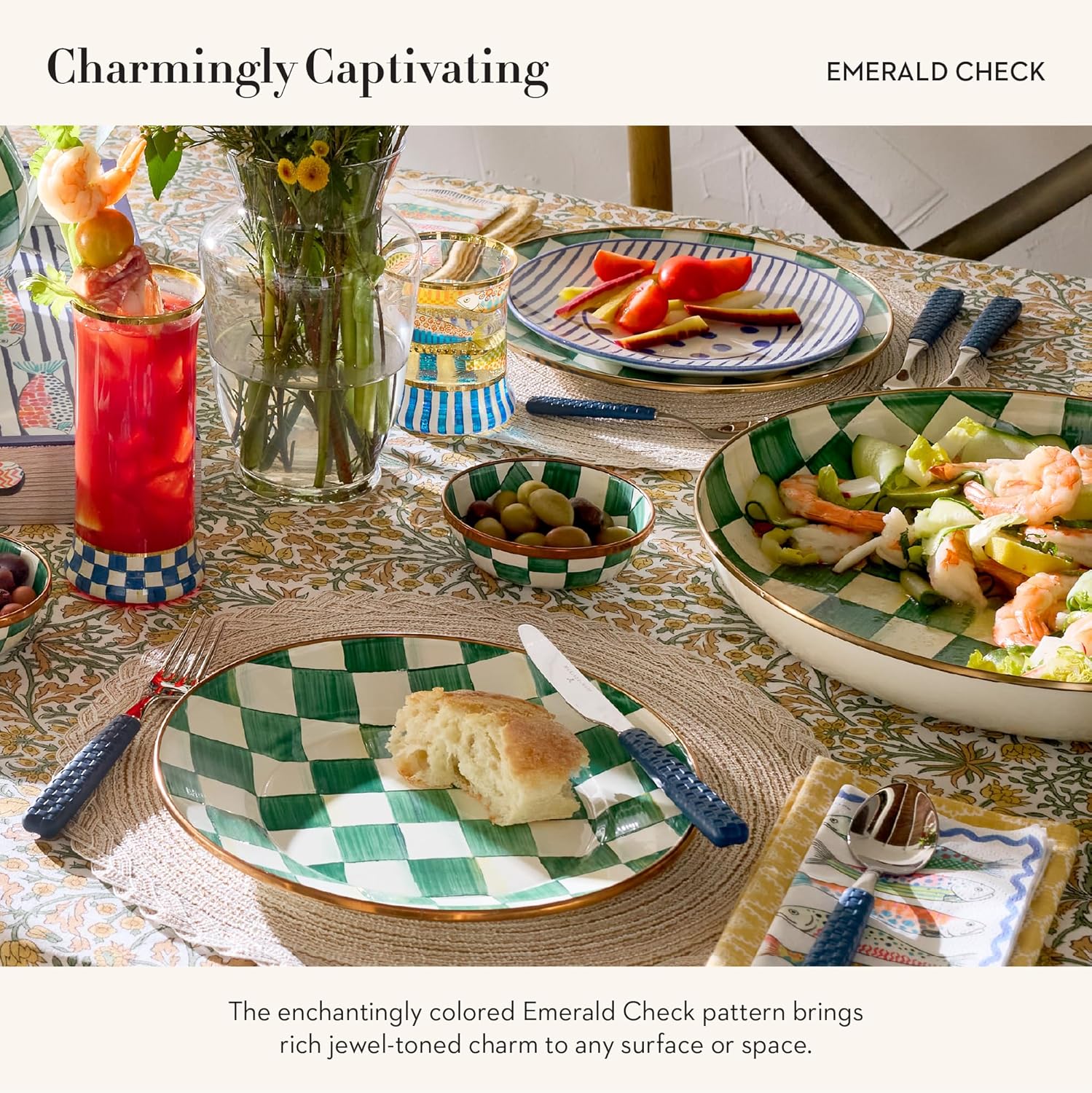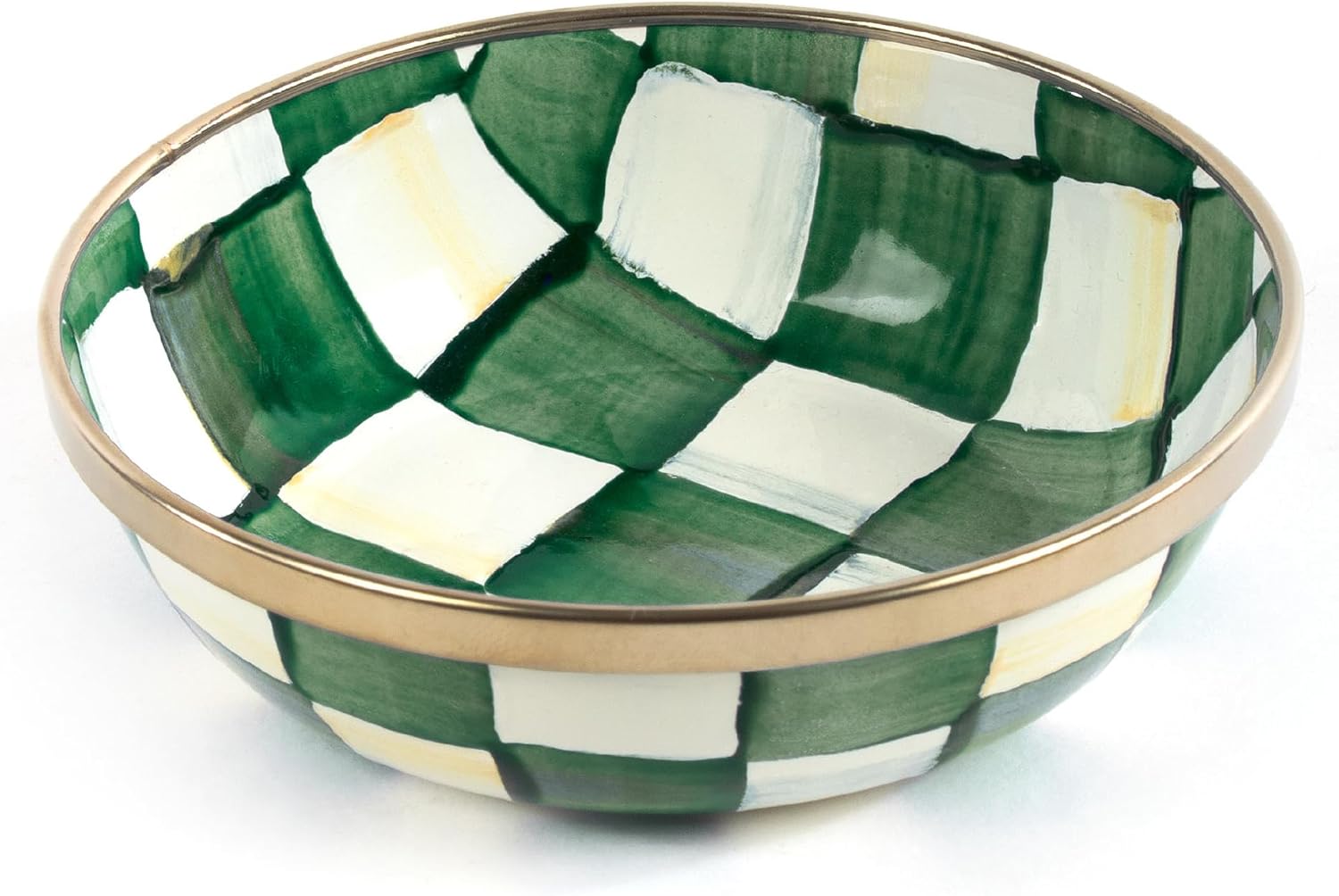 - ENTERTAINING ESSENTIAL: Elevate your serving dishes for every single snack or meal with our Emerald Check small bowl for relish. It features hand-painted, color-dragged green-and-white checks on enameled steel and has a bronzed stainless-steel rim.