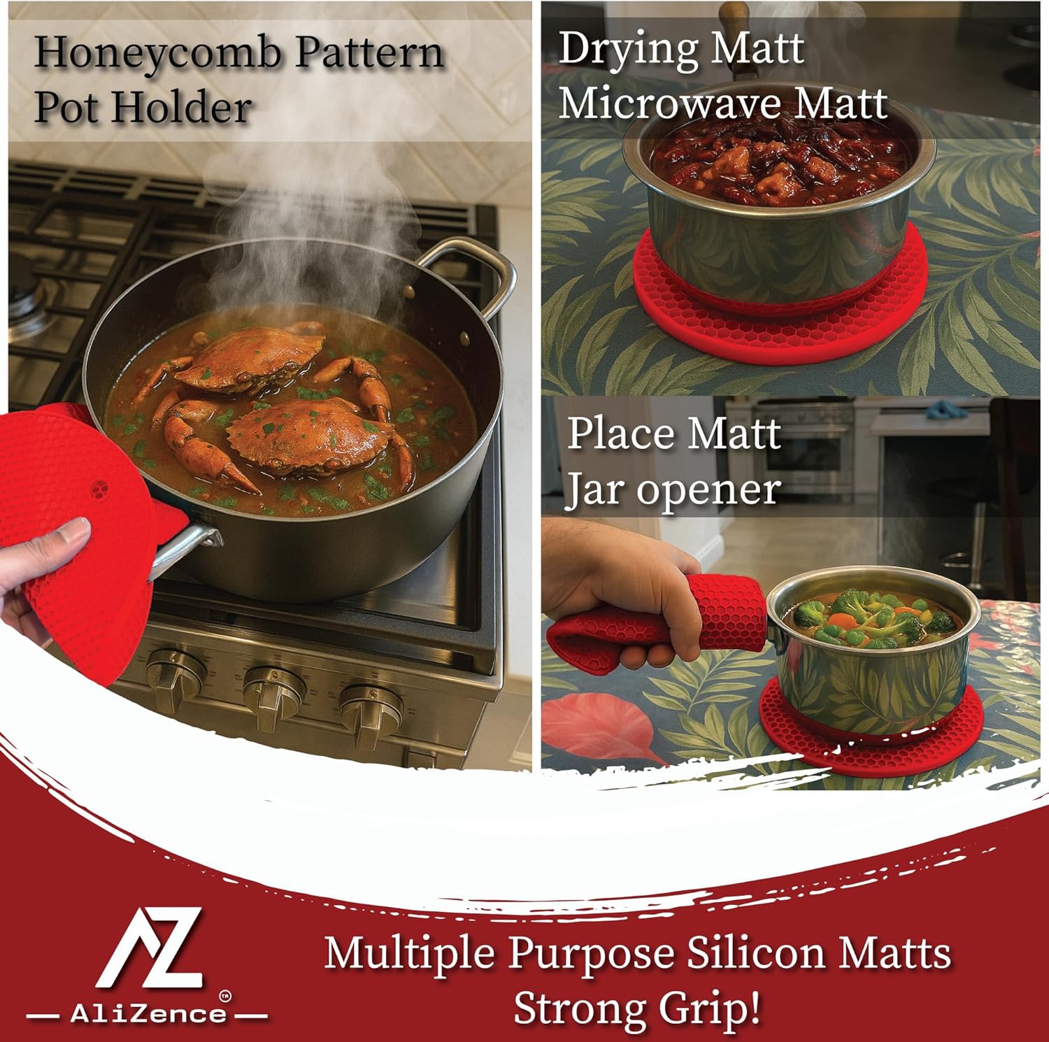 - Complete 6-Piece Kitchen Set: The AliZence Kitchen Essentials Set Includes two long silicone gloves (13 inches), two silicone pinch gloves, and two round hot trivet mats, designed for handling hot cookware safely.