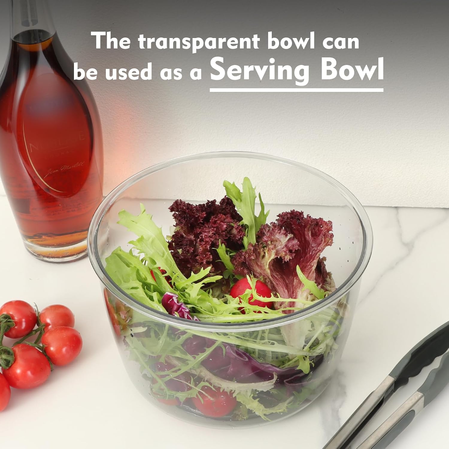 - Multi-functional design: The transparent bowl doubles as a serving bowl, letting you go straight from spinning to serving your salad without transferring to another container. The inner strainer basket can also be used as a colander, making it a versatile tool for rinsing and draining fruits, vegetables, or macaroni