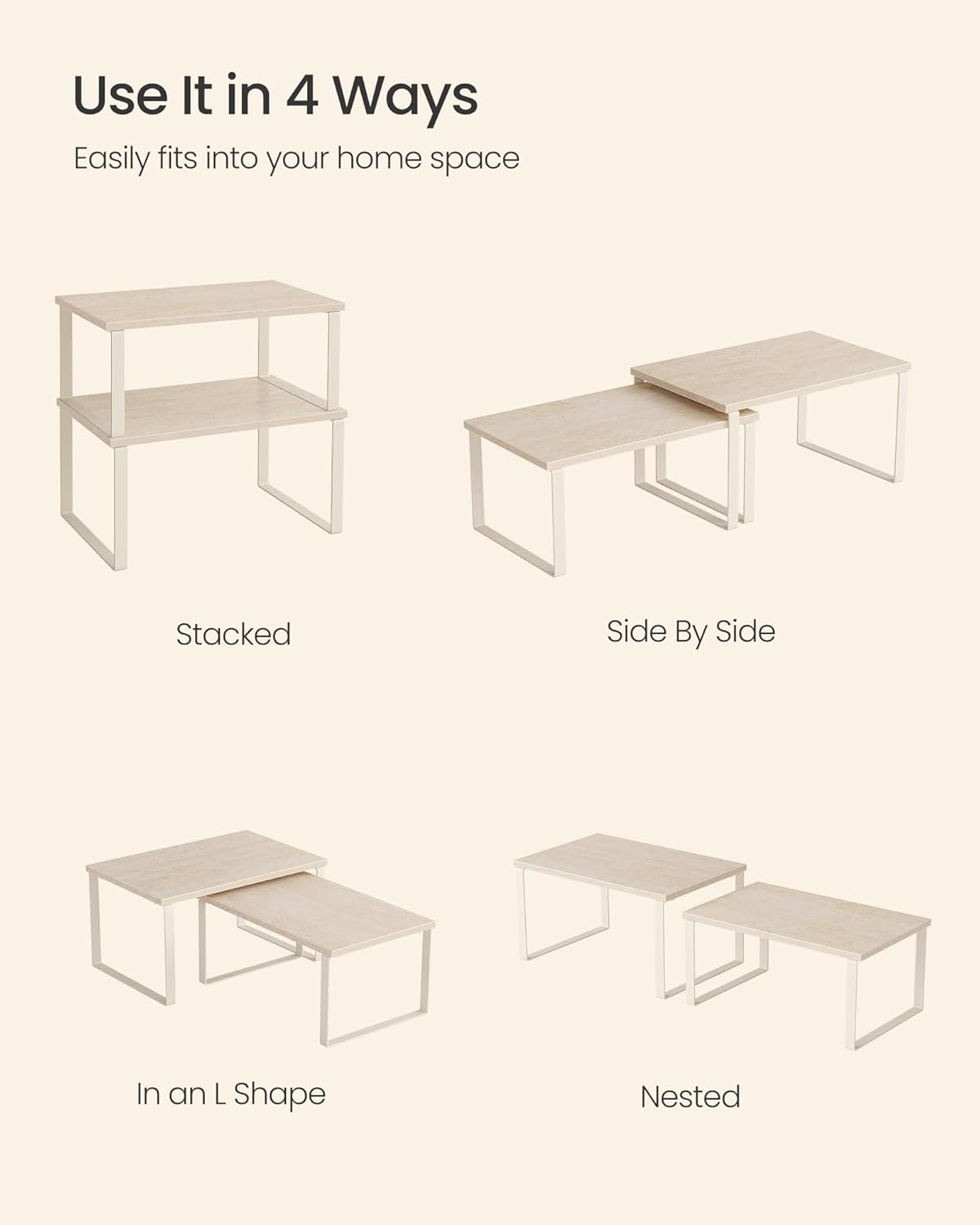 SONGMICS Cabinet Organizer Shelf, Set of 2 Kitchen Counter Shelves, Kitchen Storage, Spice Rack, Stackable, Expandable, Metal and Engineered Wood, Travertine Beige and Cream White UKCS020L01