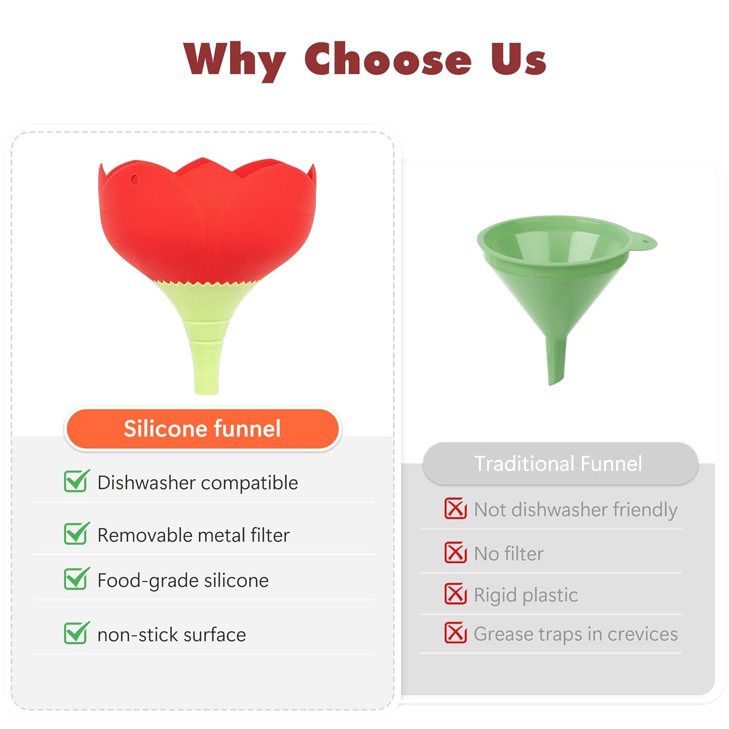 - Durable: The food funnel is made of silicone, which is soft, flexible and comfortable to touch. It is also durable and is a good partner in the kitchen for transferring liquids and filling beans, 2 pieces are enough to meet your daily needs