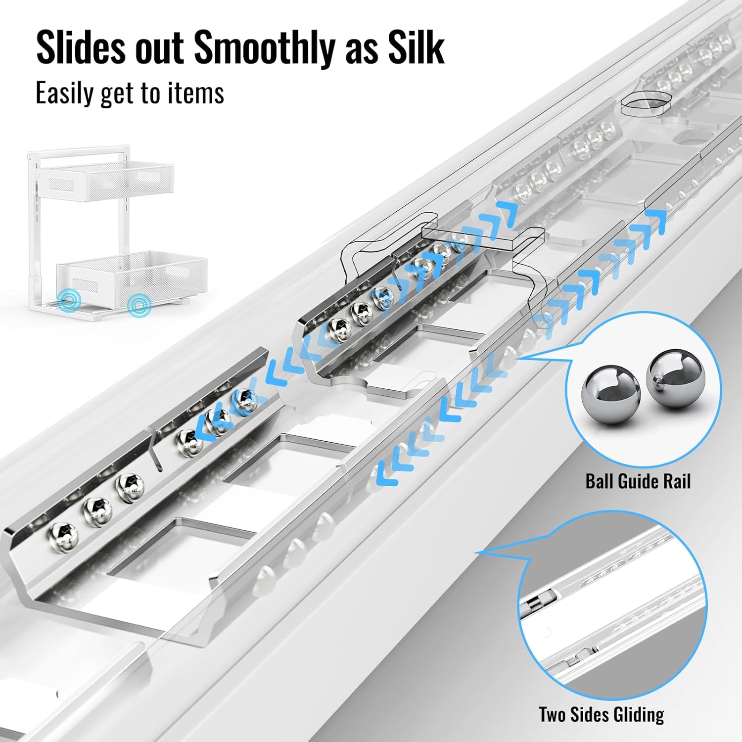- Slides out Smoothly as Silk:Effortlessly pull out & in heavy items (up to 20kg) thanks to ultra-smooth dual-track ball bearings, tested for 10,000+ cycles. Our under sink organizer is 70% smoother than standard slides even when the racks are fully loaded.