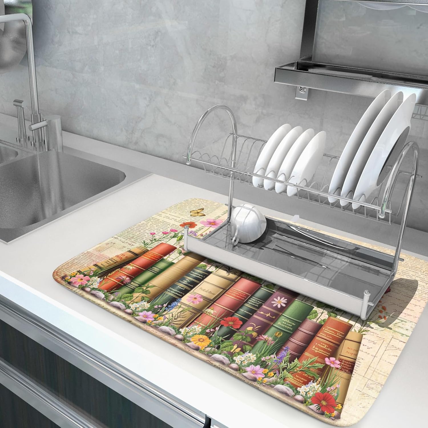 Vintage Books Dish Drying Mat - Retro Flower Kitchen Countertop Cloth Pad 18 x 24 In