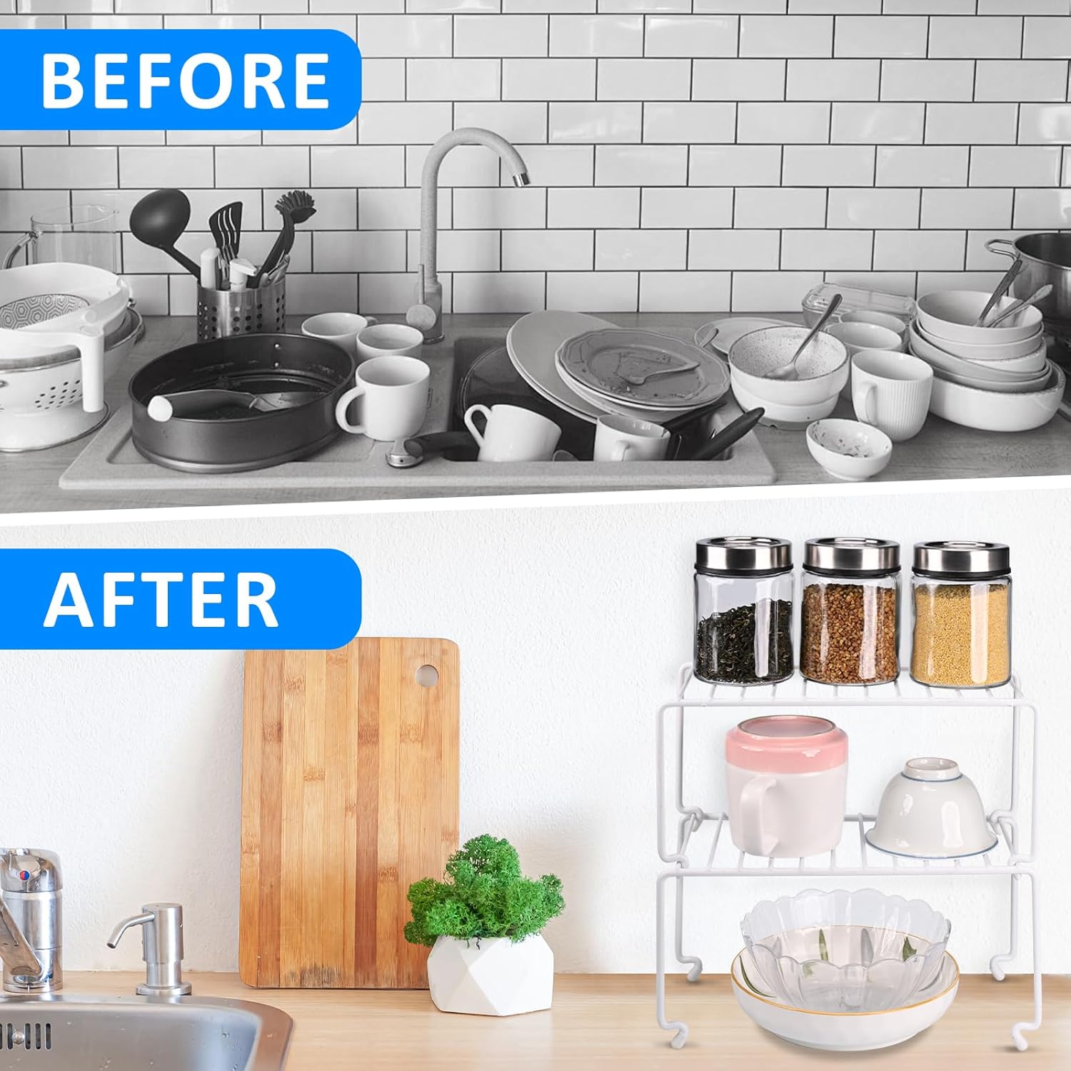 - Sleek White Stackable Shelf Organizer Rack: Crafted with durable wire shelving, this versatile shelf organizer rack adds instant hidden storage to kitchen cabinets, pantries, or under sink organizers. Perfect for creating stackable shelves to maximize vertical space for the organizer for cabinet needs, spice rack setups, or tea bag organizer systems. Sized at 10.8x5.3 inches, it fits snugly in tight spaces while offering sturdy shelving for bins, baskets, or small appliances.