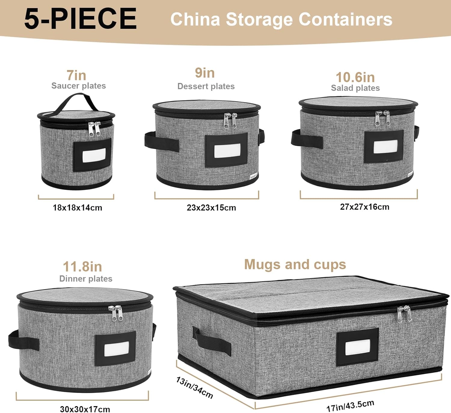 - 🥛5-Piece China Storage Set:This China organizer includes 4 plate cases (11" dinner, 10" salad, 9" dessert, 7" saucer) and 1 mug case (holds 12 cups). Includes 48 thick felt dividers for perfect spacing of all your tableware