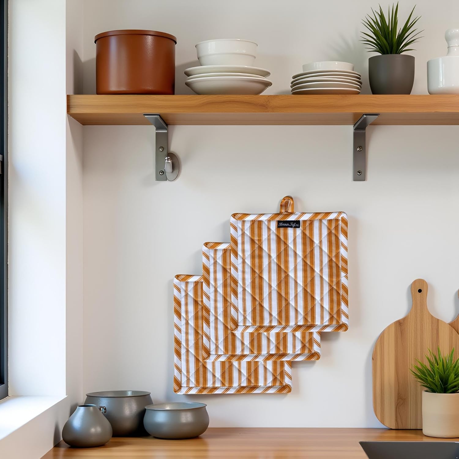 AMOUR INFINI Double Stripe Pot Holders Heat Resistant Cotton Set of 3 Nonslip 8"x8" Inch Hot Pads for Kitchen, BBQ, Baking & Cooking with Hanging Loops (Yellow)
