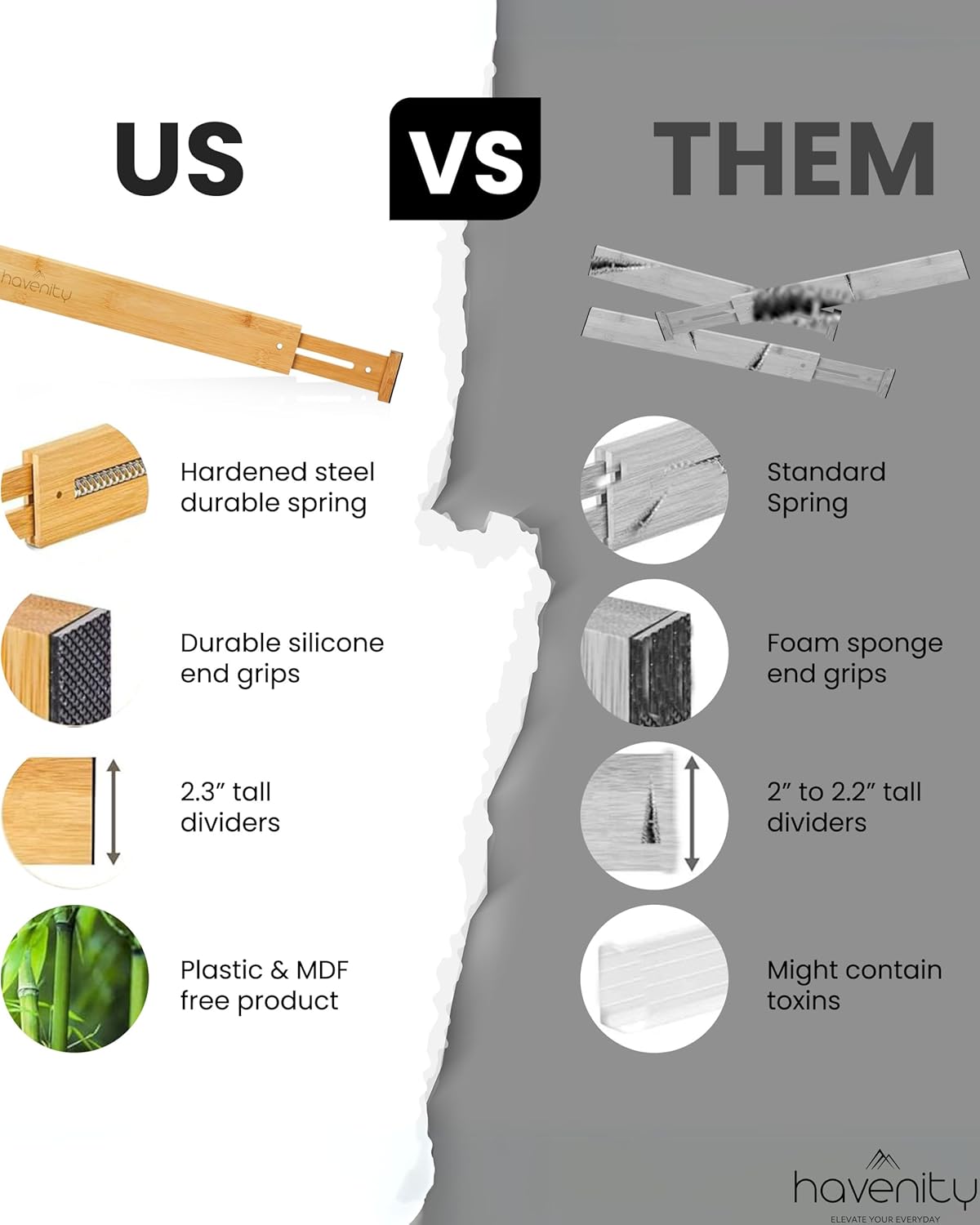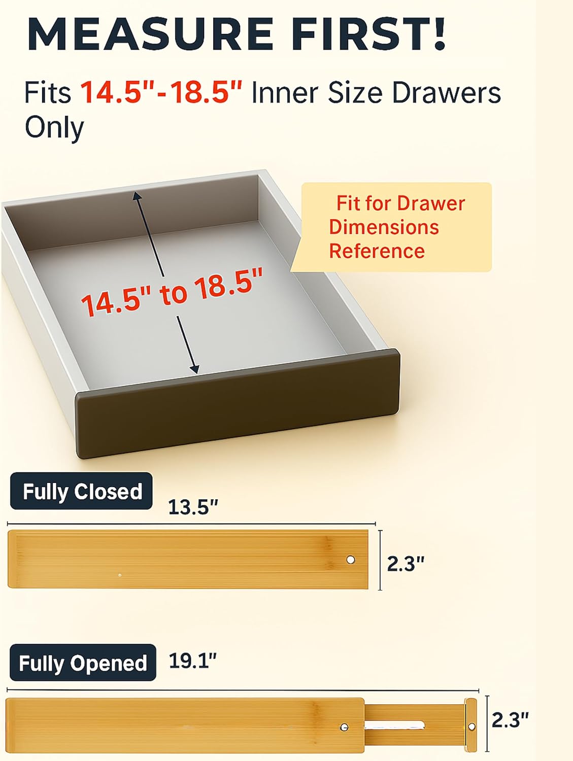 - EXPANDABLE ORGANIZATION: Our adjustable drawer dividers expand from 14" to 19.1"; You can be installed in your kitchen, bedroom, office drawers, baby's room, desk and bathroom.Our bamboo kitchen drawer dividers are equipped with non-slip pads on both ends, which helps to keep them in place and protect both the drawer and organizer itself.