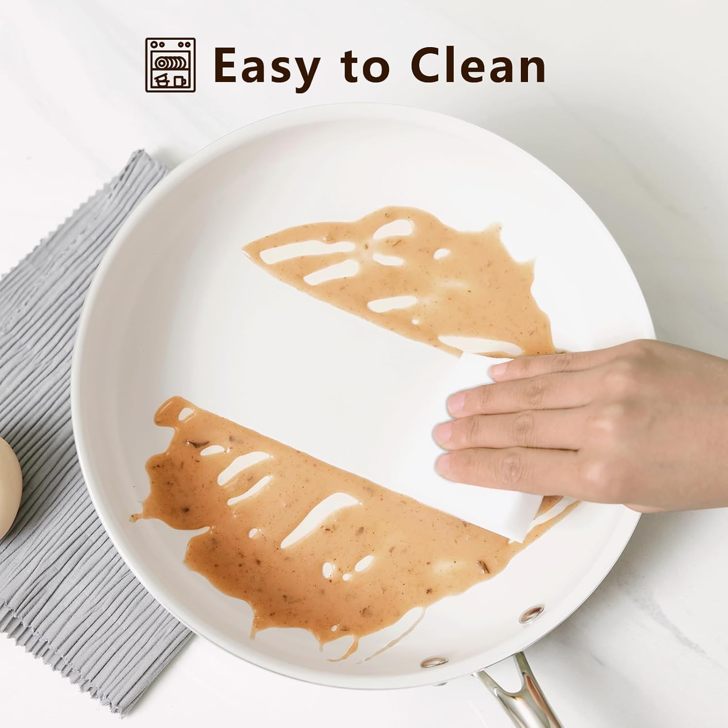 - Non-stick Coating: The nonstick ceramic coating made in USA, SGS approved. non-toxic, PFAS PFOA & PTFE free. Our frying pan requires less oil and releases less smoke, ensuring your daily cooking is always safer and healthier.