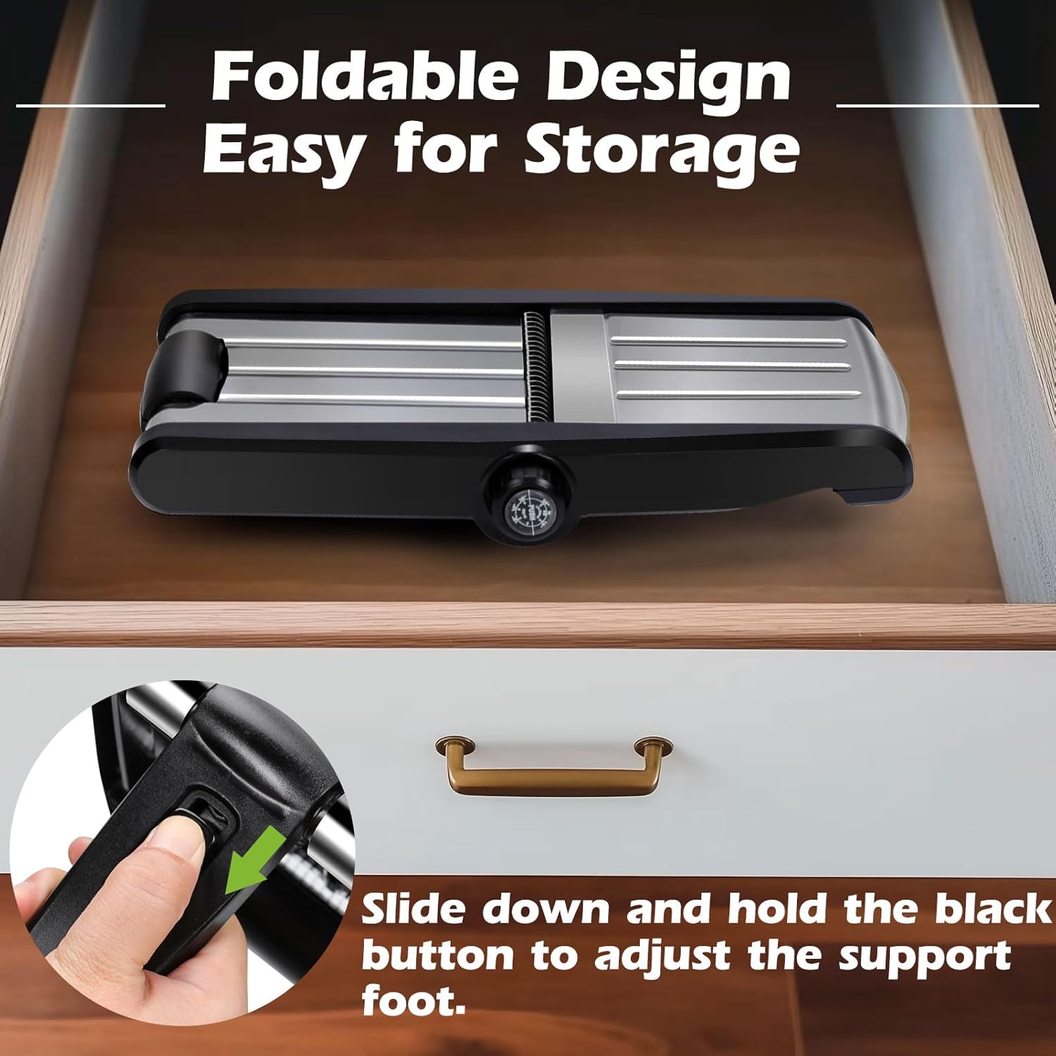 - ăEasy to StoreăThe mandoline is designed with easy storage in mind. Its compact size and foldable design make it simple to store in your kitchen drawer or cupboard. You wonât need to worry about clutter or finding space for this mandoline vegetable slicer, making it a practical addition to your kitchenware collection. Itâs ideal for small kitchens or those looking to maximize storage efficiency.