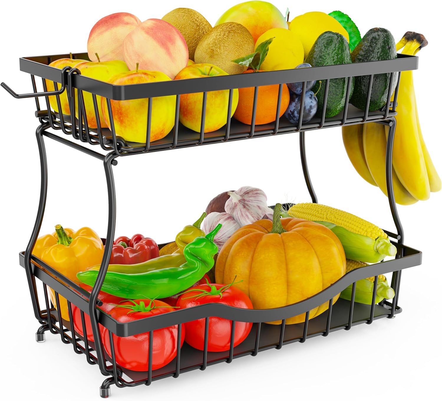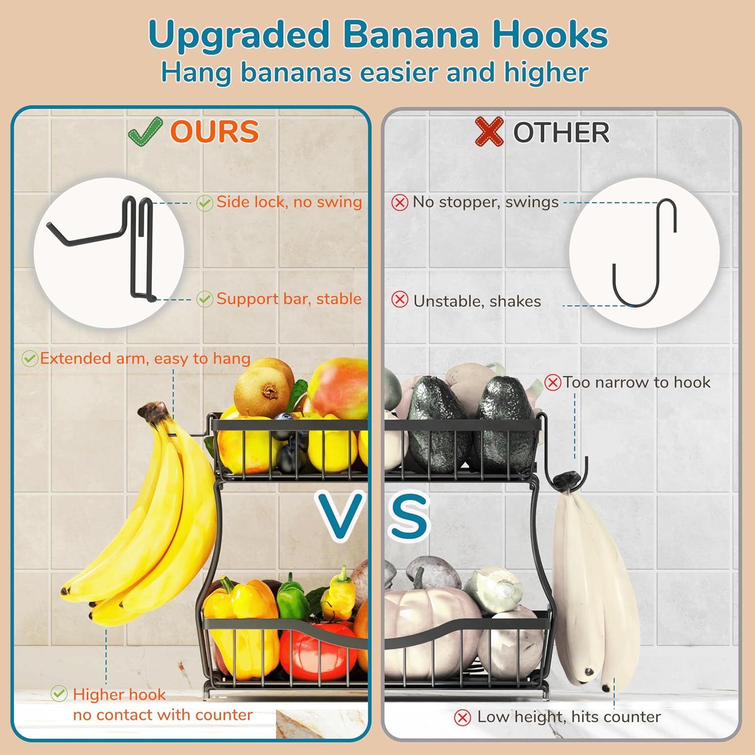 Large 2-Tier Fruit Basket for Kitchen Counter with 2 Banana Hangers – Metal Fruit Bowl for Onion, Vegetable, Snacks, Breads Storage – Countertop Organizer – Black, 14.5" W x 9.5" D