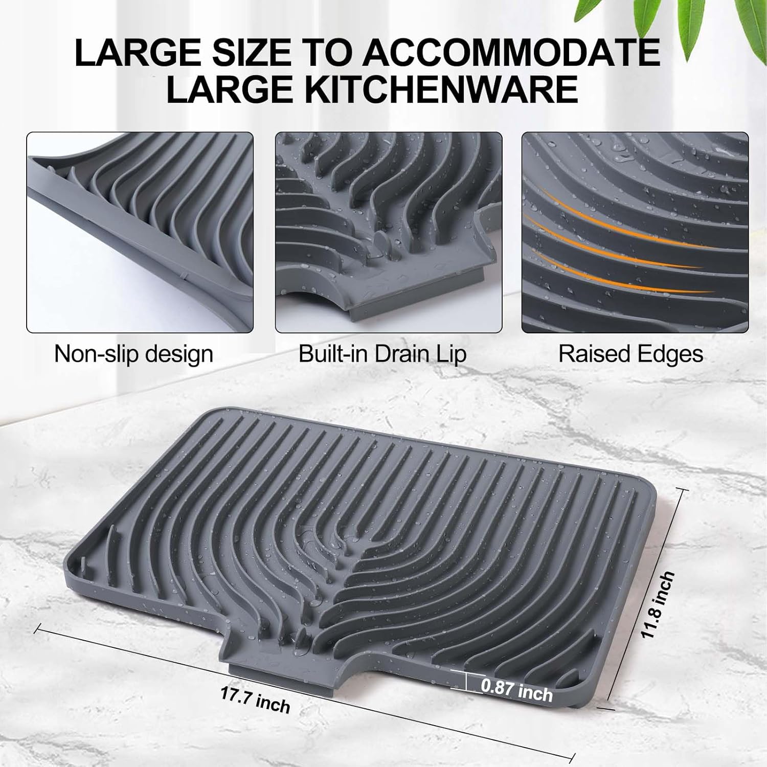 Silicone Dish Drying Mat for Kitchen Counter, (Grey, 18 x12 Raised Sink), Easy Clean Pad for Countertop Protection, Fast Self-Draining Slope, Non-Slip, Multiple Use