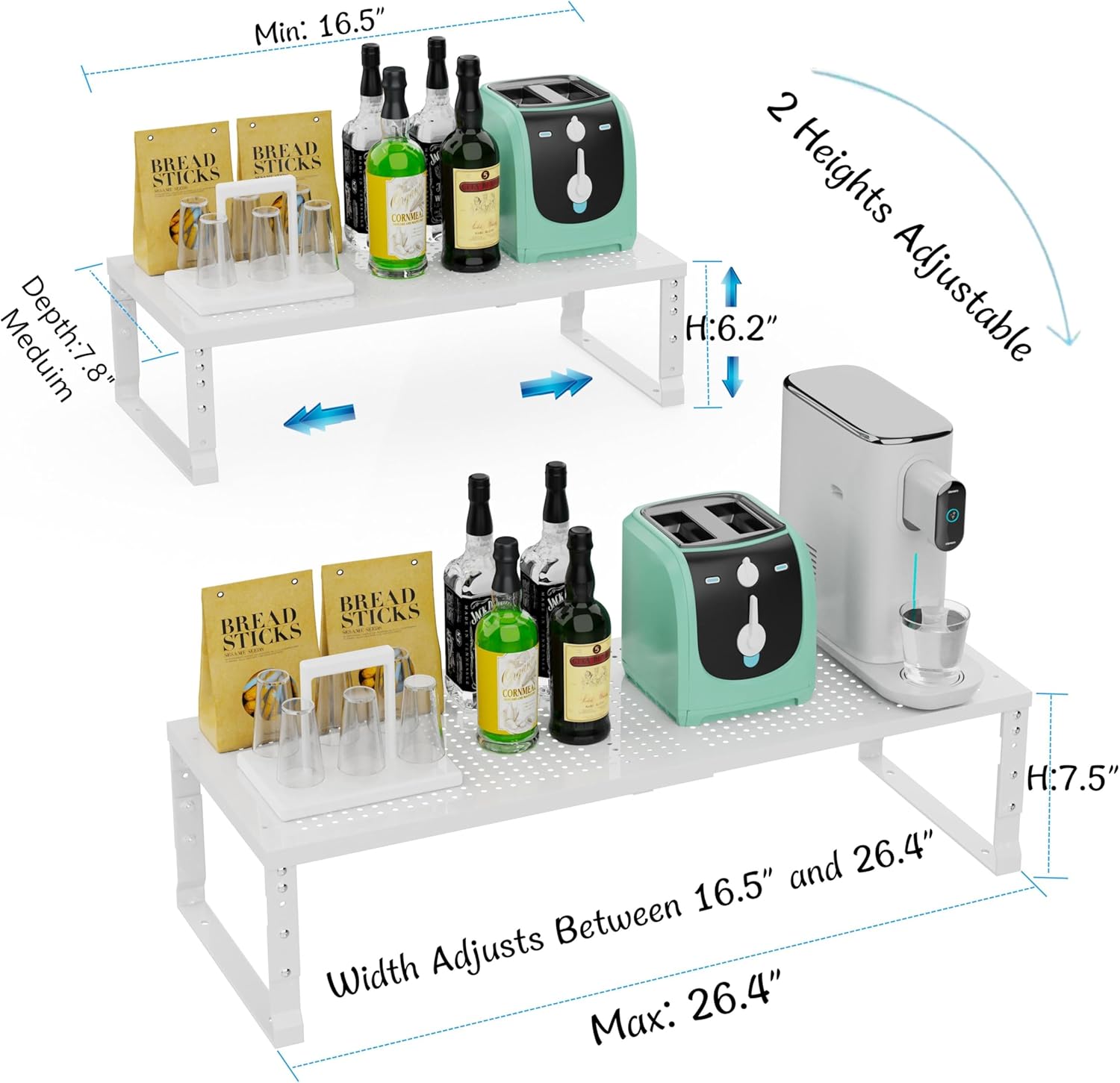 - â ăAdjustable & Expandable Cabinet Shelf Organizeră Customize your kitchen storage with our expandable metal shelving unit! Easily adjust the length from 16.5" to 26.4" to fit cabinets, countertops, or pantry spaces (dimensions: 16.5~26.4"W x 7.8"D x 6.2~7.5"H). Stack multiple units vertically to create a tiered storage solution for maximum space efficiencyâperfect for plates, bowls, mugs, or canned goods.