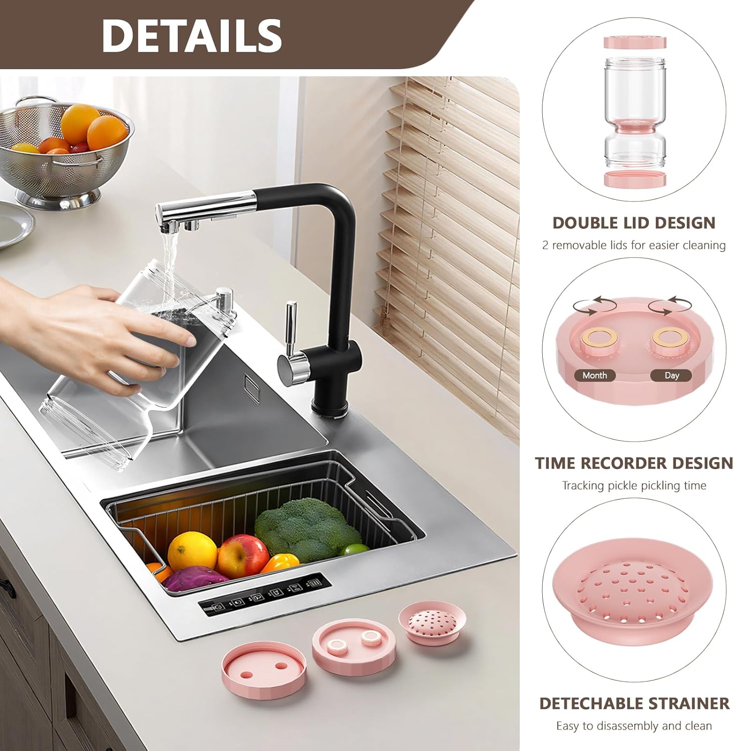 - KEEP IT FRESH AND TIDY: Our pickle container features a clever double-layer isolation design that easily separates the pickles from the pickle juice, so you don't have to worry about splashing pickle juice. Simply flip the pickle jar with strainer to drain the liquid, take the pickle, and flip it back to preserve the pickle in the brine. Say goodbye to sticky hands and splashing juice!