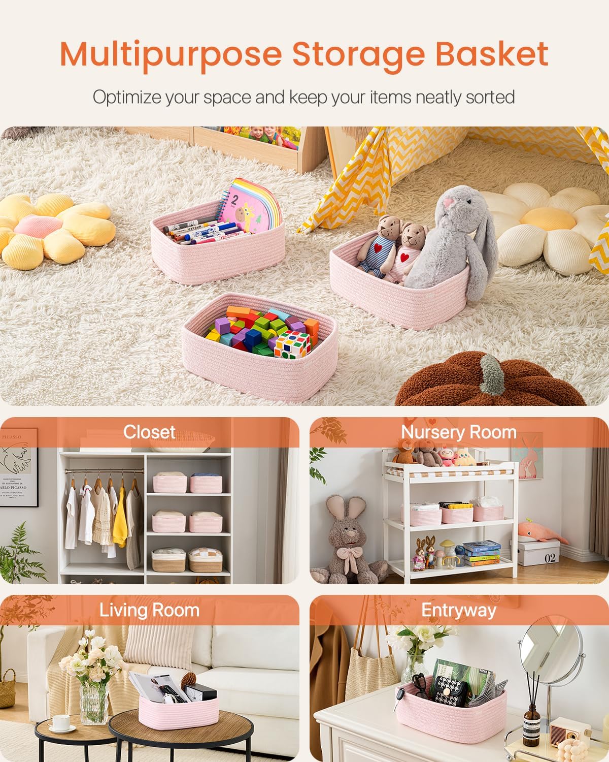 Small Woven Basket, 12 x 8 x 4.5 Inches, Storage Basket for Organizing, Cute Small Rope Shelf Closet Cube Storage Bins Baskets for Shelves, Dog Toy Gift Baskets Empty, 3 Pack Light Pink