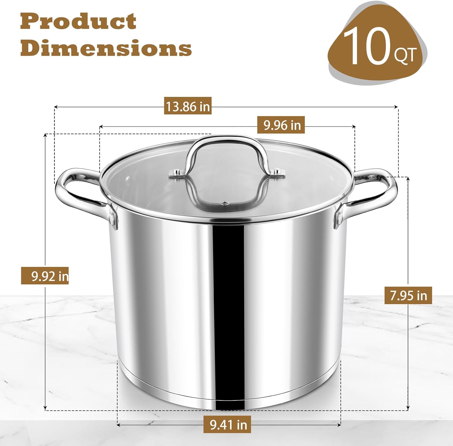 - 【Sturdy & Excellent Designs】Thickened tri-ply bottom constructed with right angle side and right wight, Enhance the stability and aesthetics of stock pot, Also feel heavy duty in your hands, The clear measuring markings and up to 10qt help to control the fixed amount of food, Double thick u-shape handles of pasta pot are firmly fastened by strong rivets, Strong enough to carry the heavy food and transport easily without breaking, Smooth rolled edges protect your hands from hurting when using and for a comfortable grip