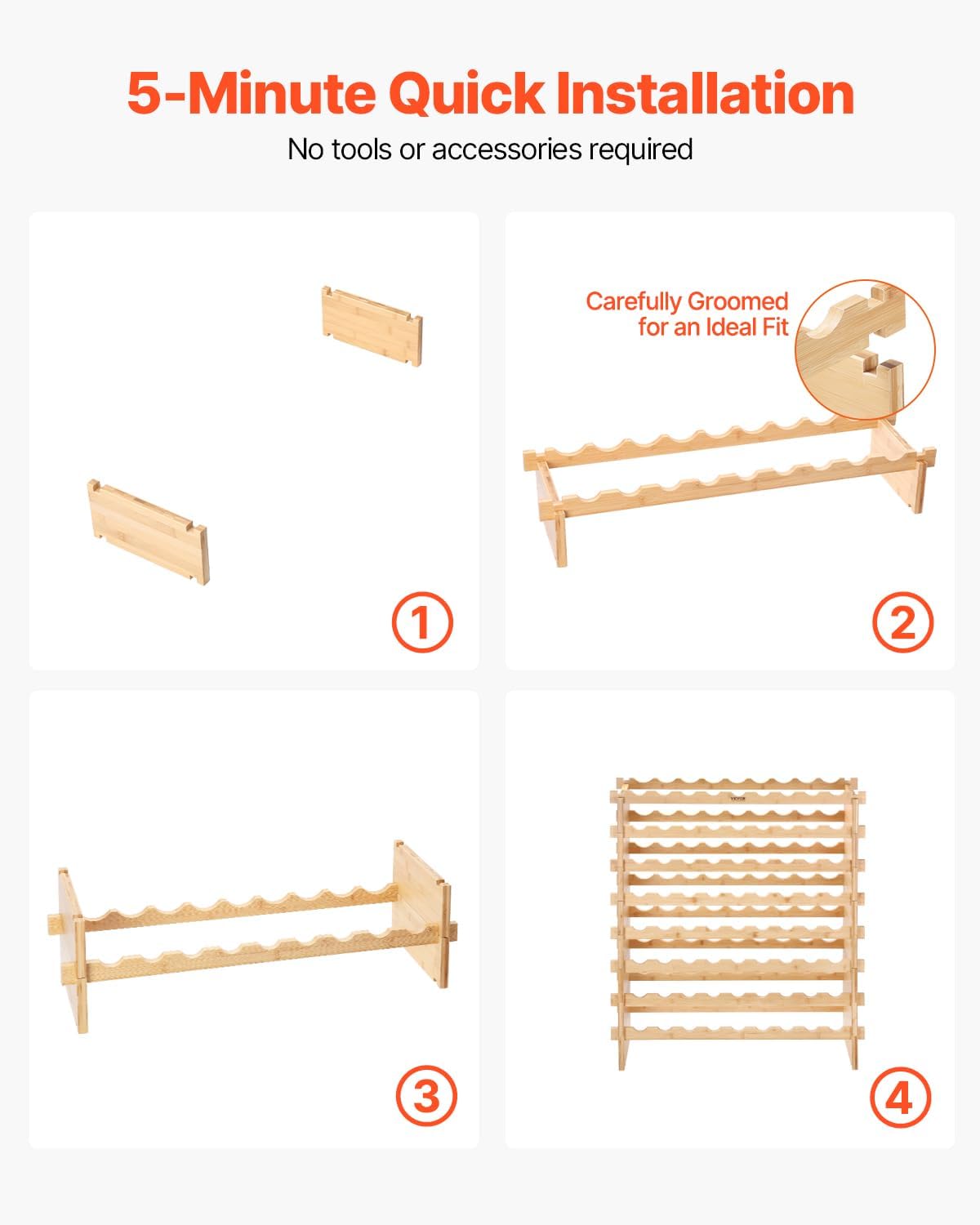 - Effortless Assembly: Set up the wine storage in just 5 minutes—no tools, screws, or nails required. The assembly process is simple, but ensure all parts are correctly aligned before starting. For security, remove all bottles before repositioning the rack.
