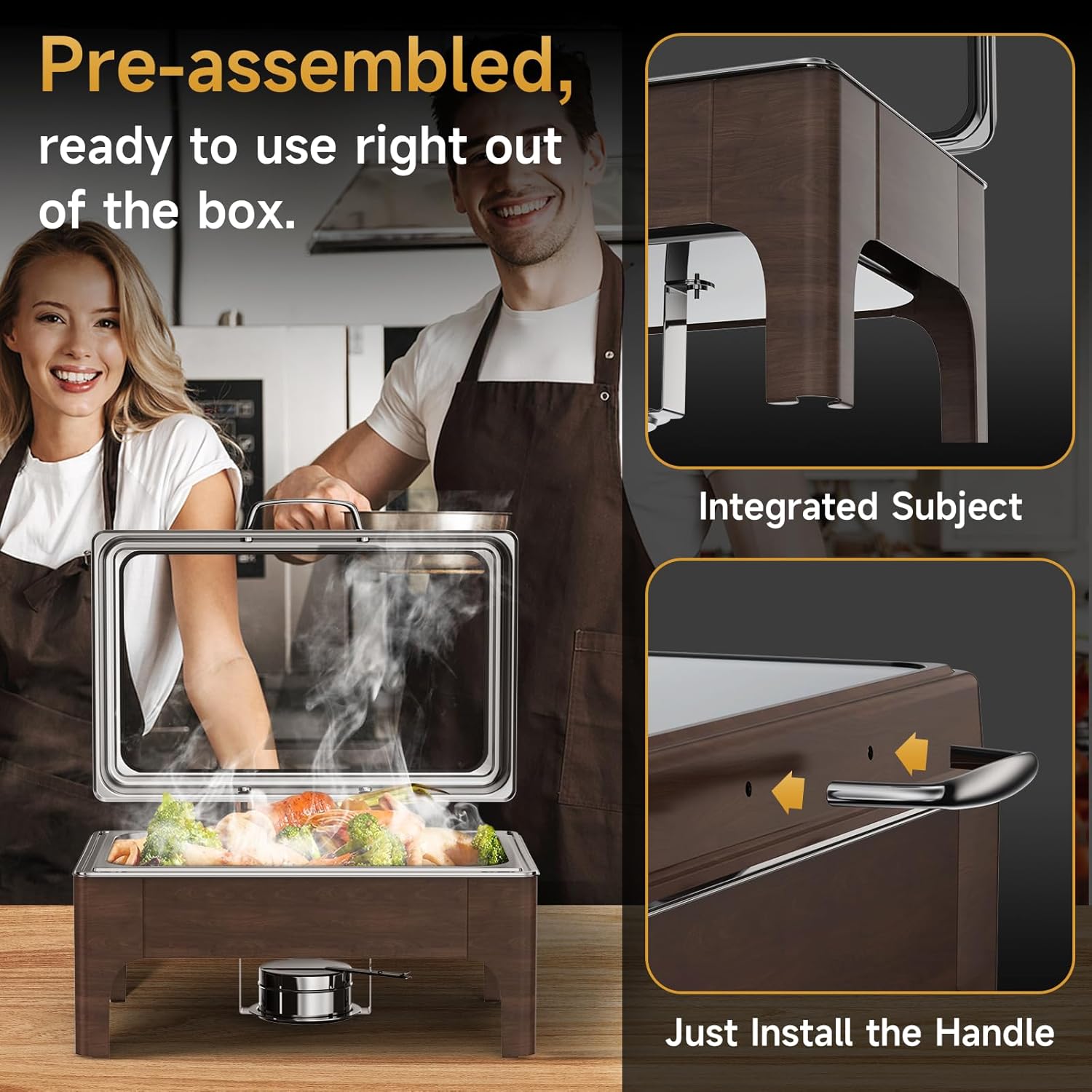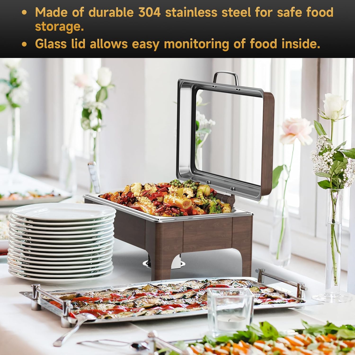 Chafing Dishes for Buffet, 9.5QT Square Stainless Steel Chafing Dish with Transparent Hydraulic Lid, 304 Food Pan, Buffet Warmer for Parties and Events (Wood Color)