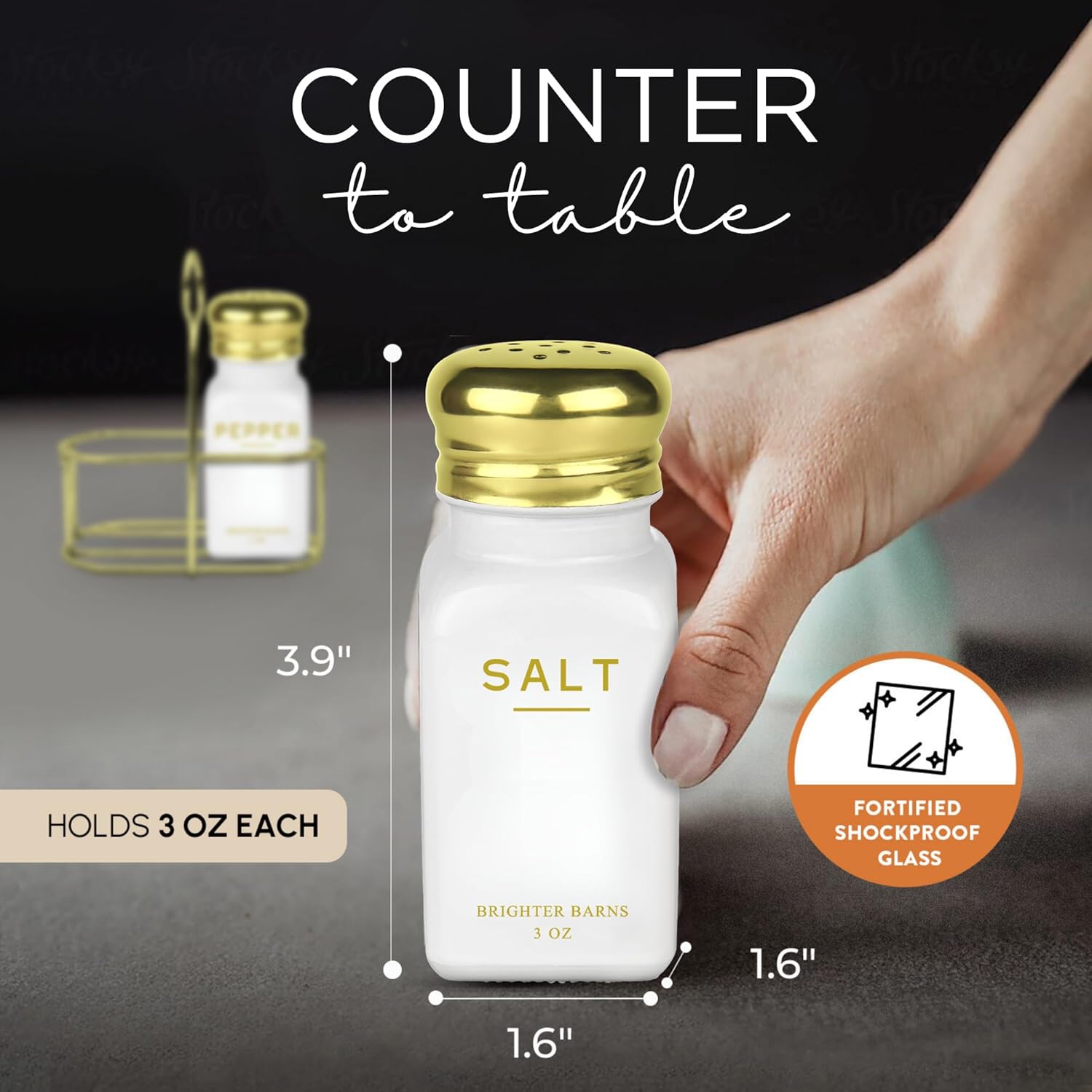 - A TOUCH OF CLASS IN EVERY MEAL - Instantly upgrade your kitchen or dining table with our modern take on the classic salt and pepper shakers with holder. Designed to complement any decor style, from contemporary luxury to cozy farmhouse and chic minimalist, this set is the charming accent your countertop deserves.