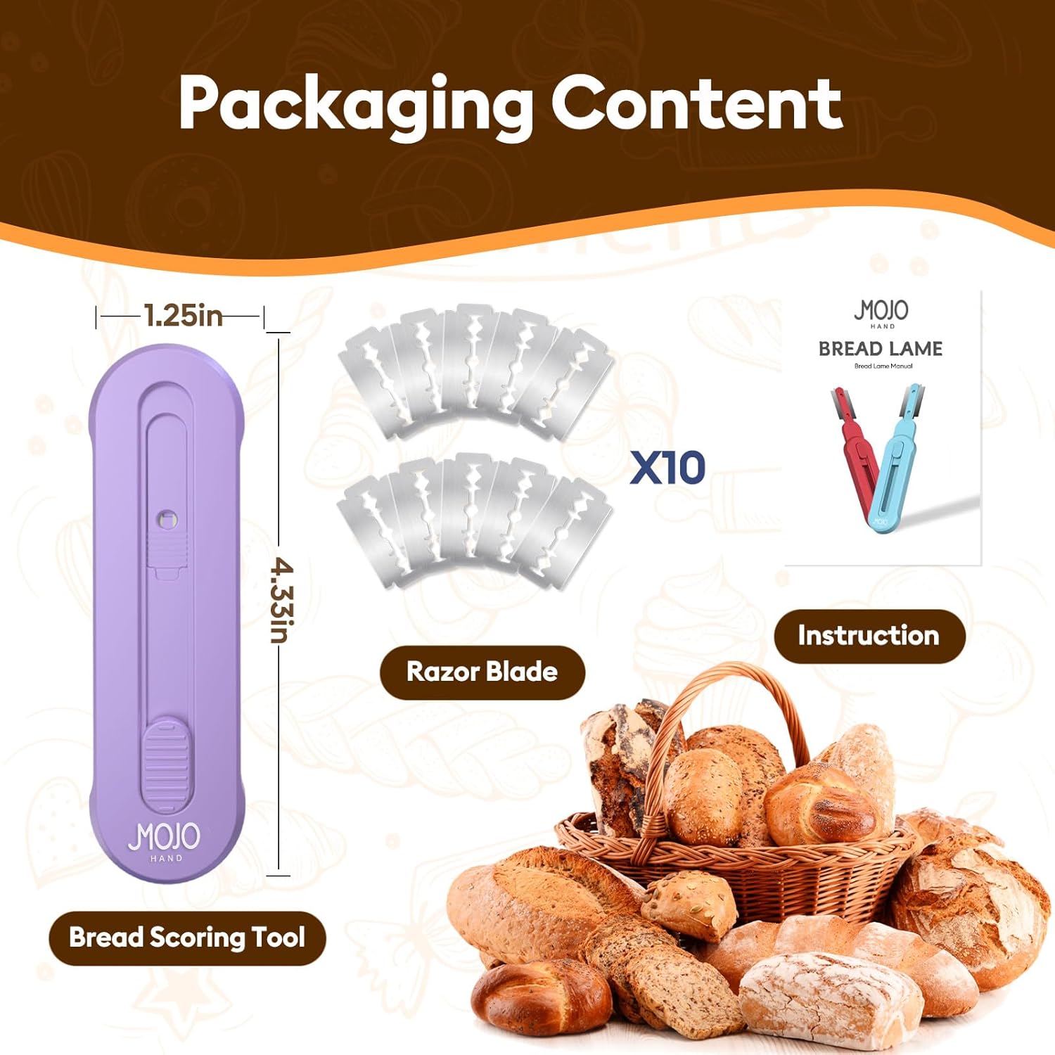 MOJOHAND Bread lame for Dough, Magnetic & Reusable Bread Lame Dough Scoring Tool, Anti-Slip Handle with Long Retractable Razor blades, Sourdough Scoring tool for Bread Making (Purple)