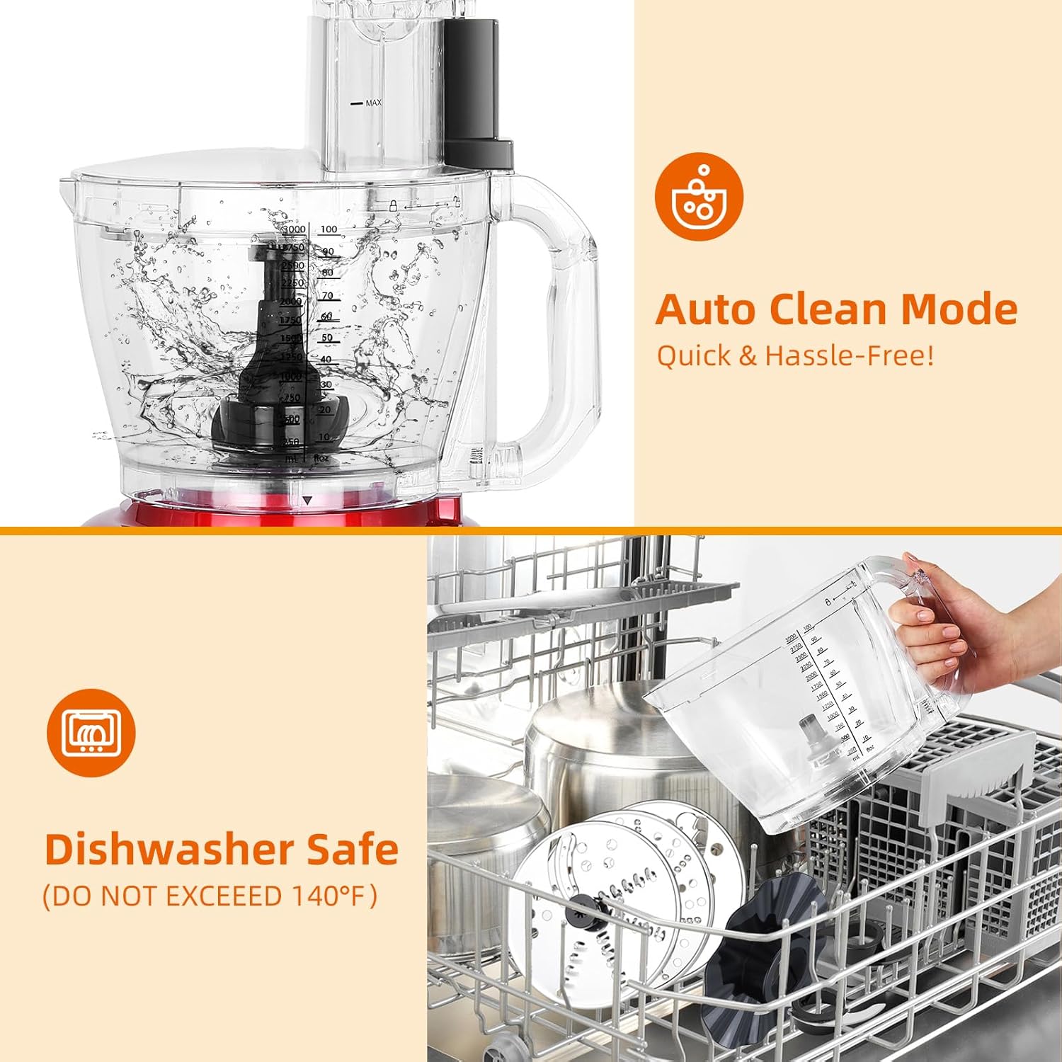 - ăEasy to Clean & Dishwasher-Safe Partsă Hate cleanup? Use the Auto Clean modeâjust add water and soap, then let our food processor red do the work! All detachable blades and bowls are also dishwasher-safe (except the motor base), making post-cooking cleanup quick and hassle-free. Perfect for busy home cooks who want a powerful, large capacity food processor thatâs easy to maintain.ďźNote:Ensure the water temperature doesn't exceed 140°F and use an appropriate amount of detergent for cleaning.)