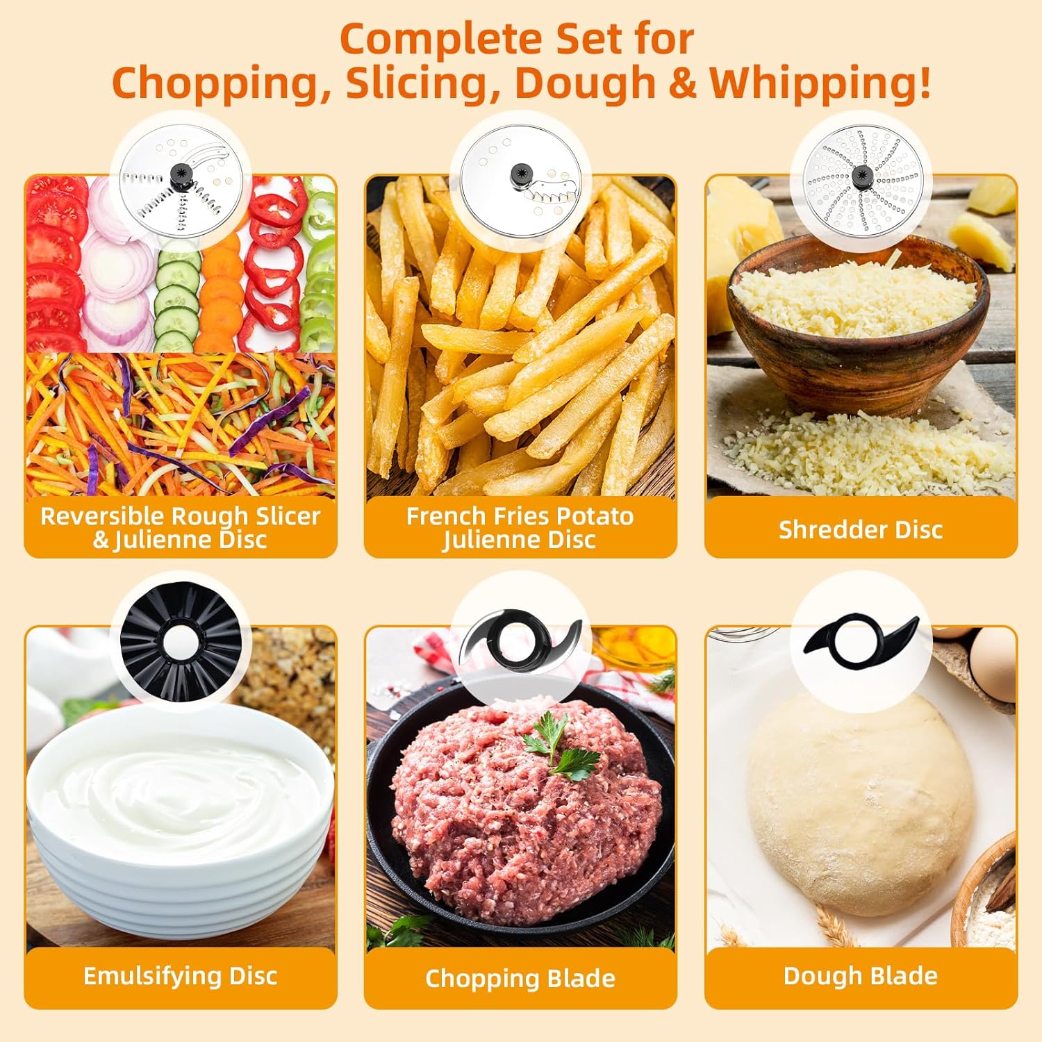 - ă8-in-1 Multifunctional Food Processor for Every NeedăFrom chopping veggies to kneading dough and whipping cream, this Homtone food processor does it all! Includes 6 premium blades: a stainless steel S-blade for chopping, a dough blade, a slicer& julienne discs, and a whisk attachmentâmaking it a true all-in-one kitchen helper.