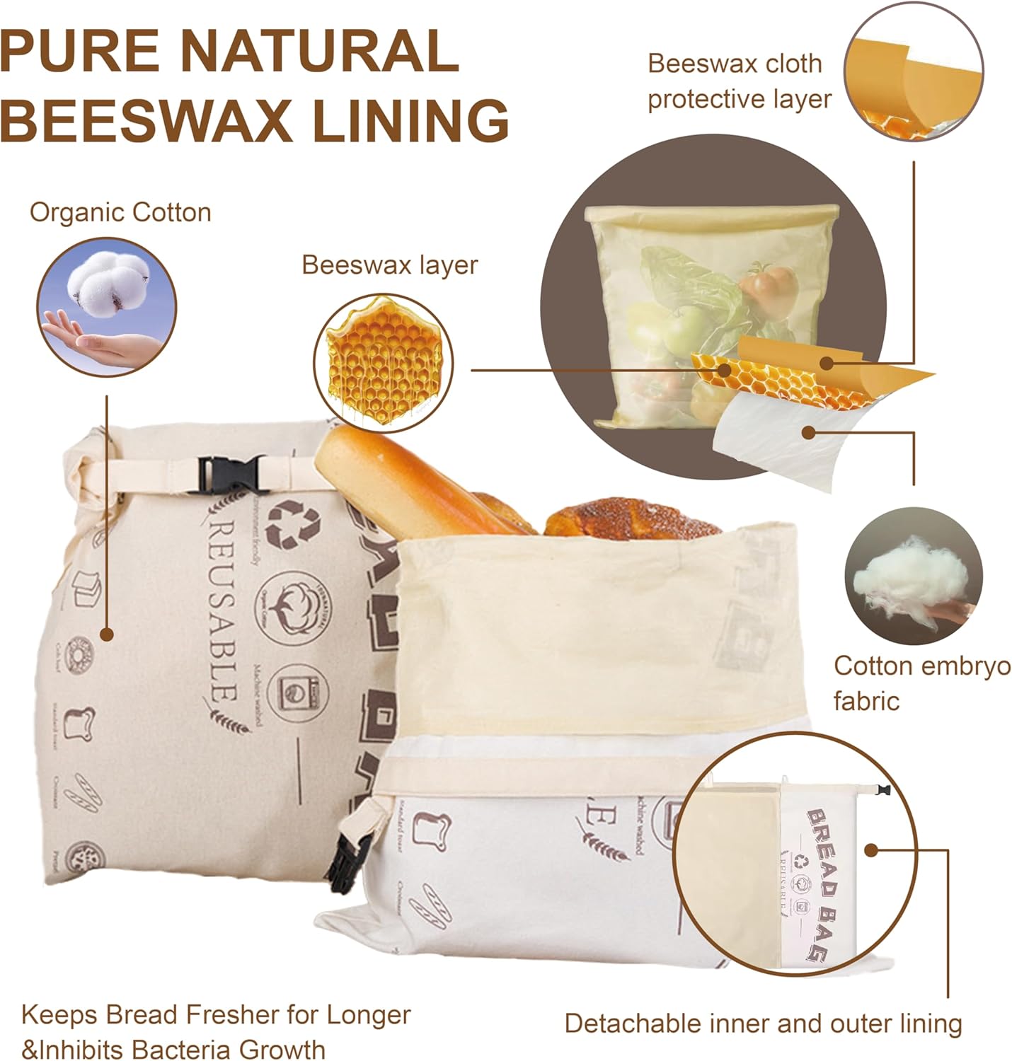 - 【Organic Cotton Fabric and Beeswax Lining】The bread bags for homemade bread is made of natural beeswax and organic cotton materials, and no chemical additives are used in the production process. The beeswax protective layer prevents moisture loss and keeps bread soft and fresh for a longer period of time compared to traditional storage methods.