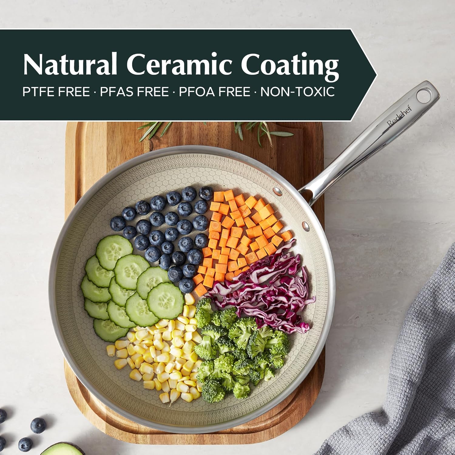 Redchef Ceramic Nonstick Frying Pan 9.5-Inch with Honeycomb Coating, Stay-Cool Handle, Dishwasher & Oven Safe, Induction Ready, PTFE PFAS-Free, All Cooktops