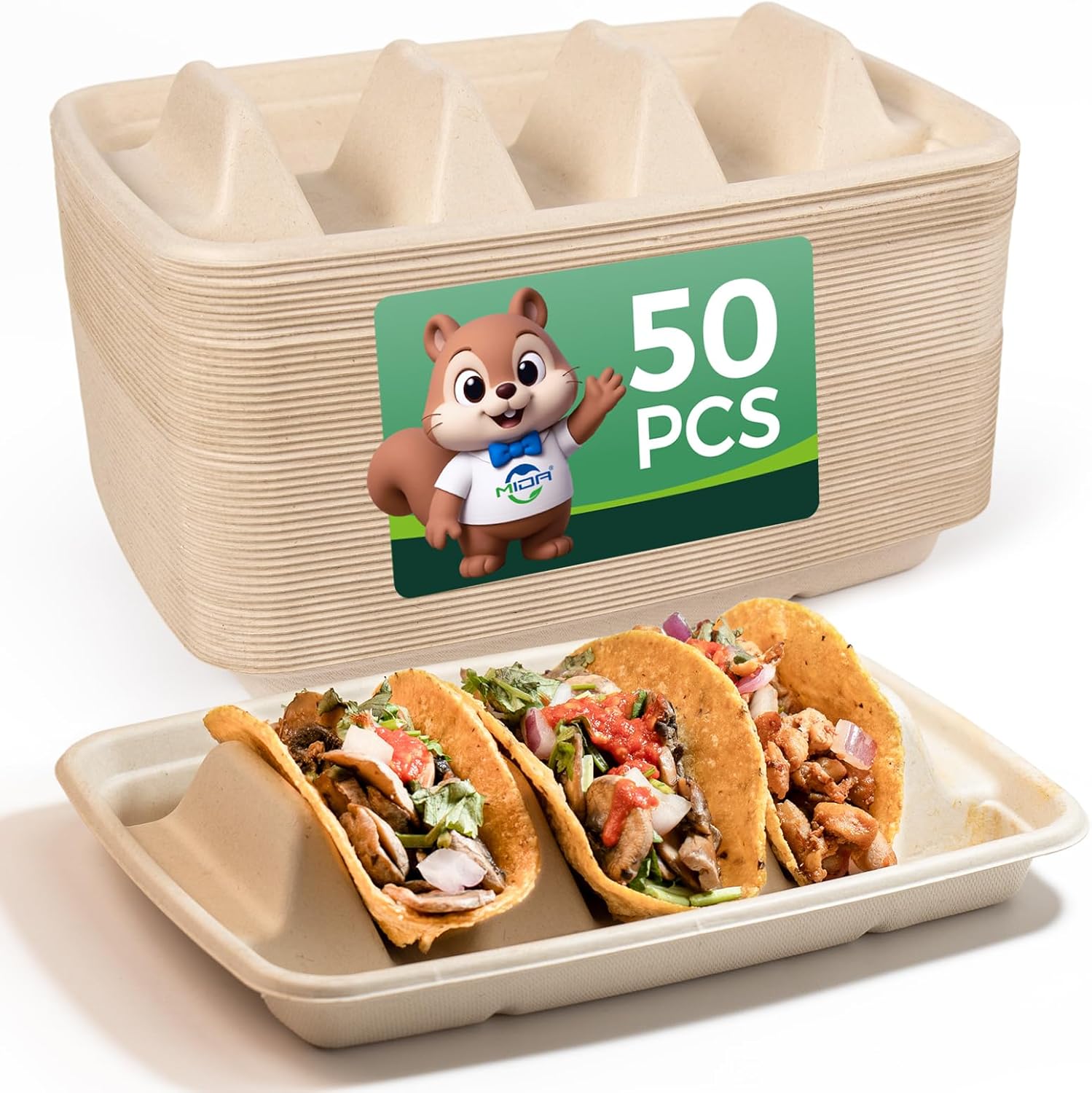 50-Pack 100% Compostable Biodegradable Paper Taco Holders, Eco-Friendly Disposable Paper Taco Tray for Taco Tuesday, Lazy Susan Taco Bar (50-Pack with lids)