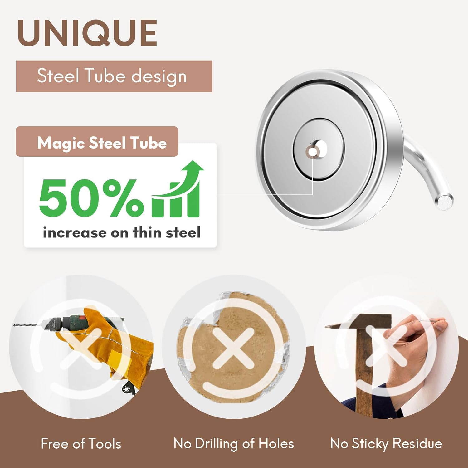 - 50% MORE HOLD ON THIN STEEL — STEEL-TUBE BOOST: Unique steel-tube design concentrates magnetic flux for about 50% more holding power vs standard magnet hooks, especially on thin metal cruise doors/walls. These heavy duty magnet hooks stay put—no slipping, no tools, no drilling.