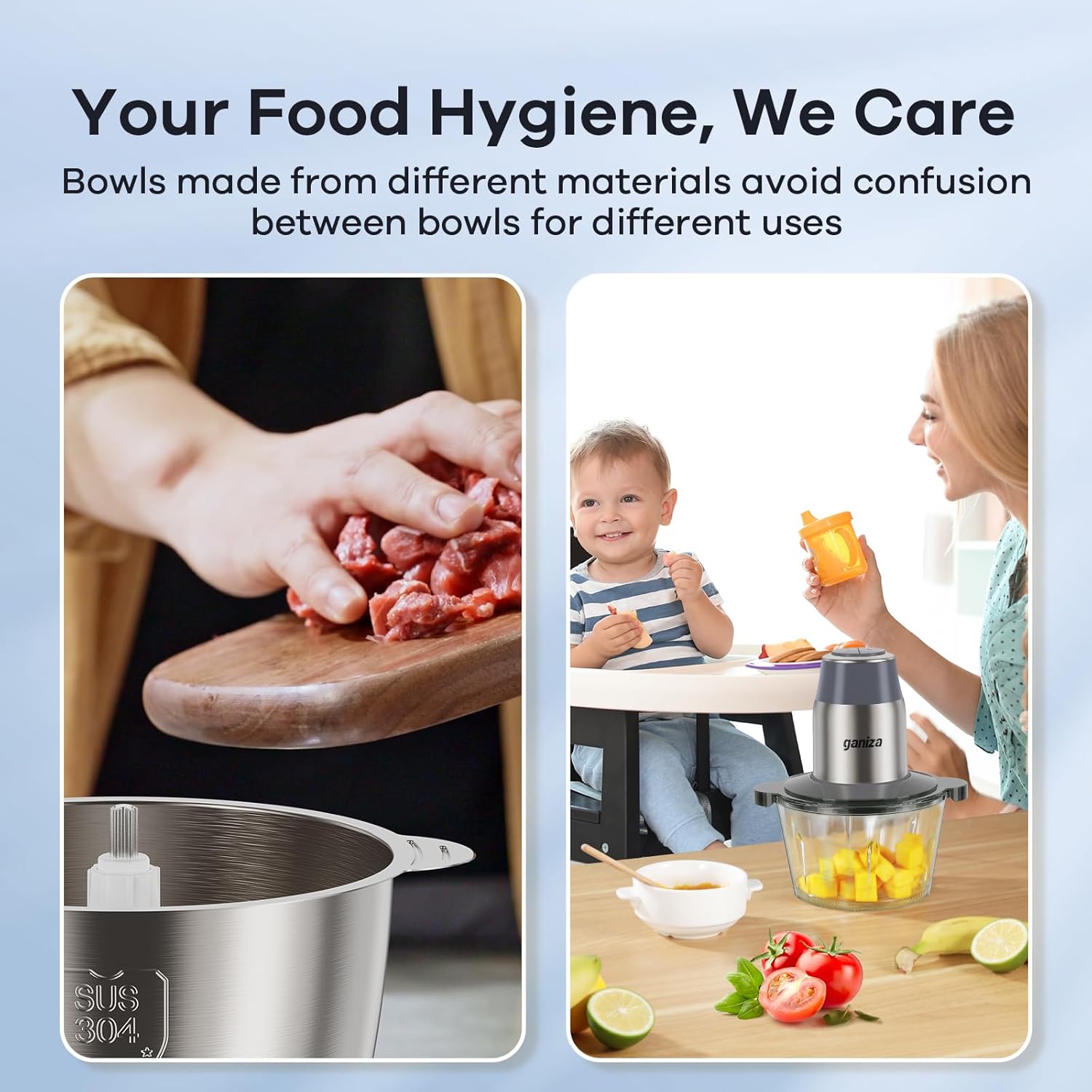 - ăUnlock Versatility with Two BowlsăYour food hygiene, we care. The Mixing Bowls are made from different materials (glass and sus 304 stainless steel) to avoid confusion between bowls for different uses, meat chopper and vegetable chopper, family processor and baby food processor.