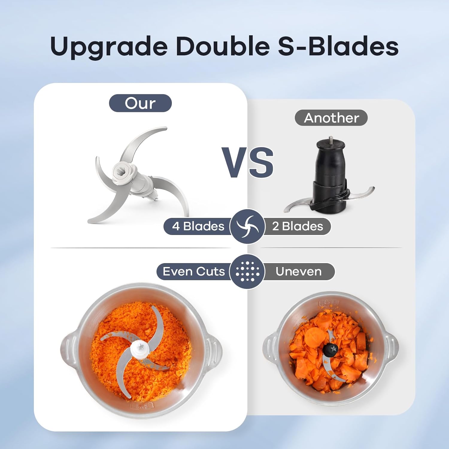 - ă2 Speed - Great Time SaverăPowerful copper motor certified for professional use combined with upgraded two levels of "S" stainless steel blades, a few seconds is enough to turn any vegetable or meat into tiny bits. 2 cutting speeds to meet different needs of foods or texture.