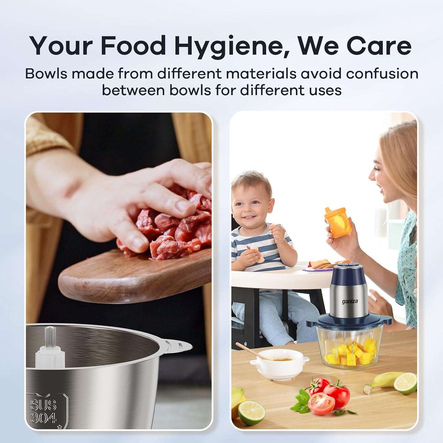 GANIZA Food Processors, Electric Chopper with Meat Grinder & Veggie Chopper - 2 Bowls with Powerful Copper Motor - Includes 2 Sets of Bi-Level Blades for Baby Food/Meat (Blue, 8 Cup+8 Cup)