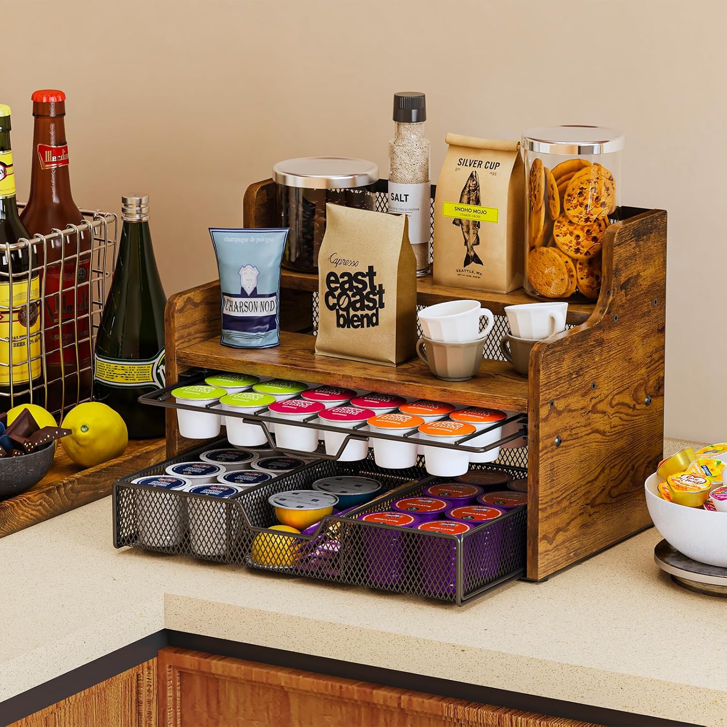 - 【Spacious Storage with Drawer】Our 4-tier coffee syrup organizer can stand 8 syrup bottles (25.4 oz/750ml) and has 2 pull-out basket that can store 35 coffee capsules. Stepped design allows for neat placement and easy access to your favorite syrup.