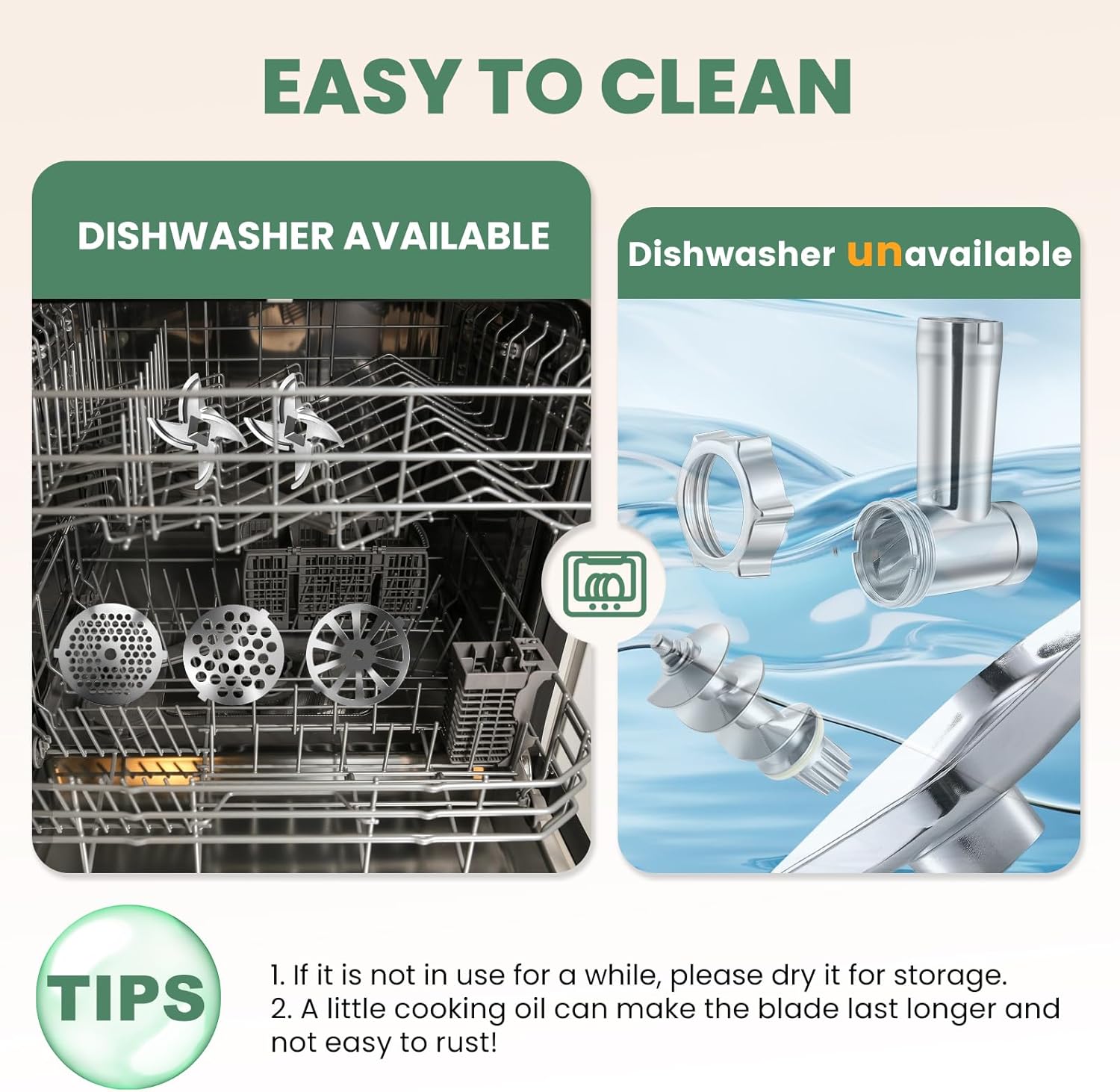 - [Effortless cleaning] Every component of this grinder for kitchen detaches in seconds: blades/plates go in the dishwasher, while the main unit wipes clean with a damp cloth