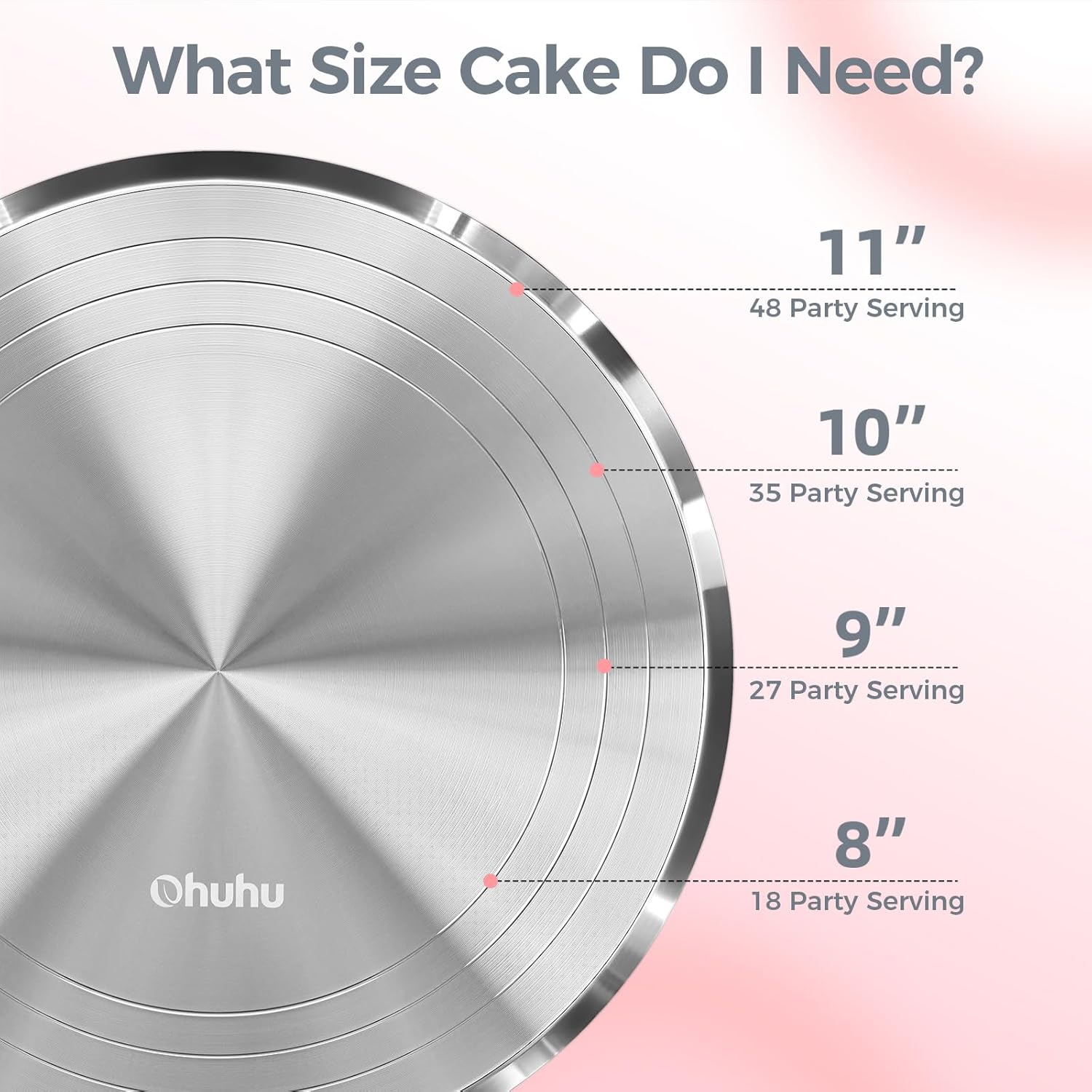 - 4 PRECISION TICK MARK: Versatile Decorating Options. There have 11.2'', 9.9'', 8.9'', 7.9'' total 4 sizes to choose to make perfect size cake as you like Whether you're a professional baker or just starting out, our cake turntable is perfect for creating beautiful designs on cakes, cupcakes, and more.