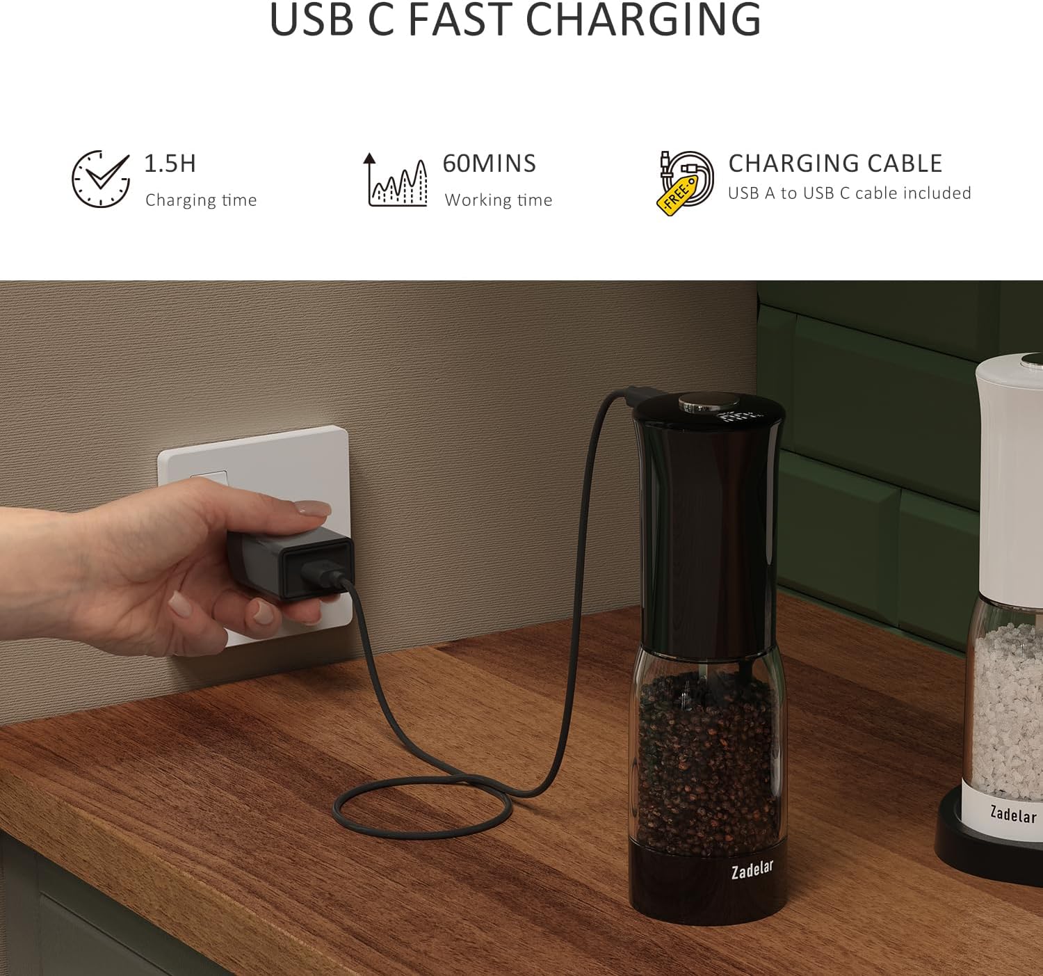 - [Amazing gift]Whether for personal use or as a gift, electric salt and pepper shakers rechargeable is a practical and stylish choice that embraces a healthier and more sustainable lifestyle.The salt and pepper grinder set electric package includes 1 x Dual Storage Base, 1 x Cleaning Brush,1xUser Manual,1xUSB-A to USB-C Cable.All Zadelar Products are covered by a 360-day hassle-free replacement or refund policy.Our support team is standing by with 12 hours fast reply.