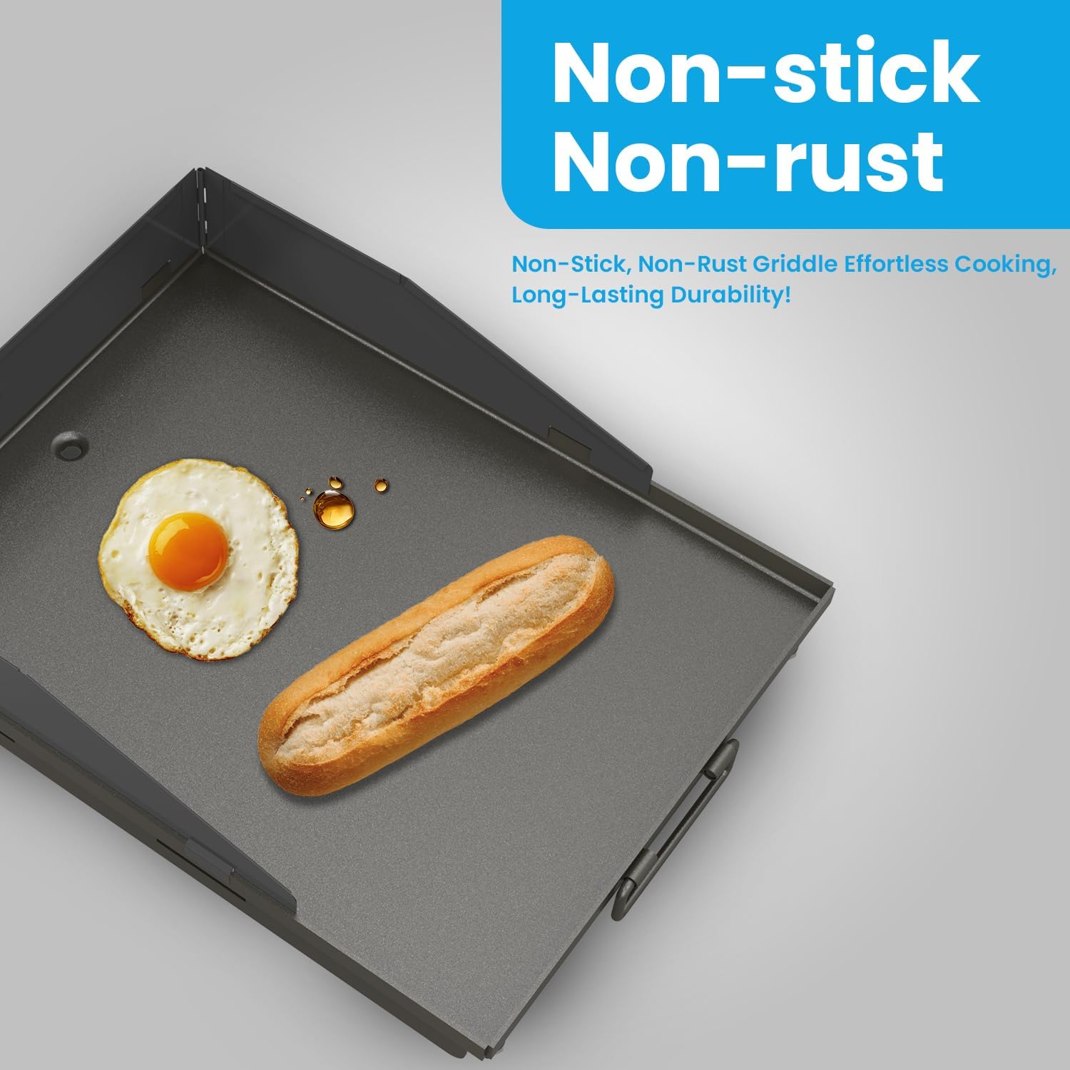- Stovetop Flat Top Griddle: Designed with high sides to keep food secure, this stove top griddle insert allows you to cook multiple items simultaneously. A built-in grease hole directs excess oil to the grease pool for mess-free outdoor griddle, while the sturdy handles make it easy to move and adjust for effortless flat grill.
