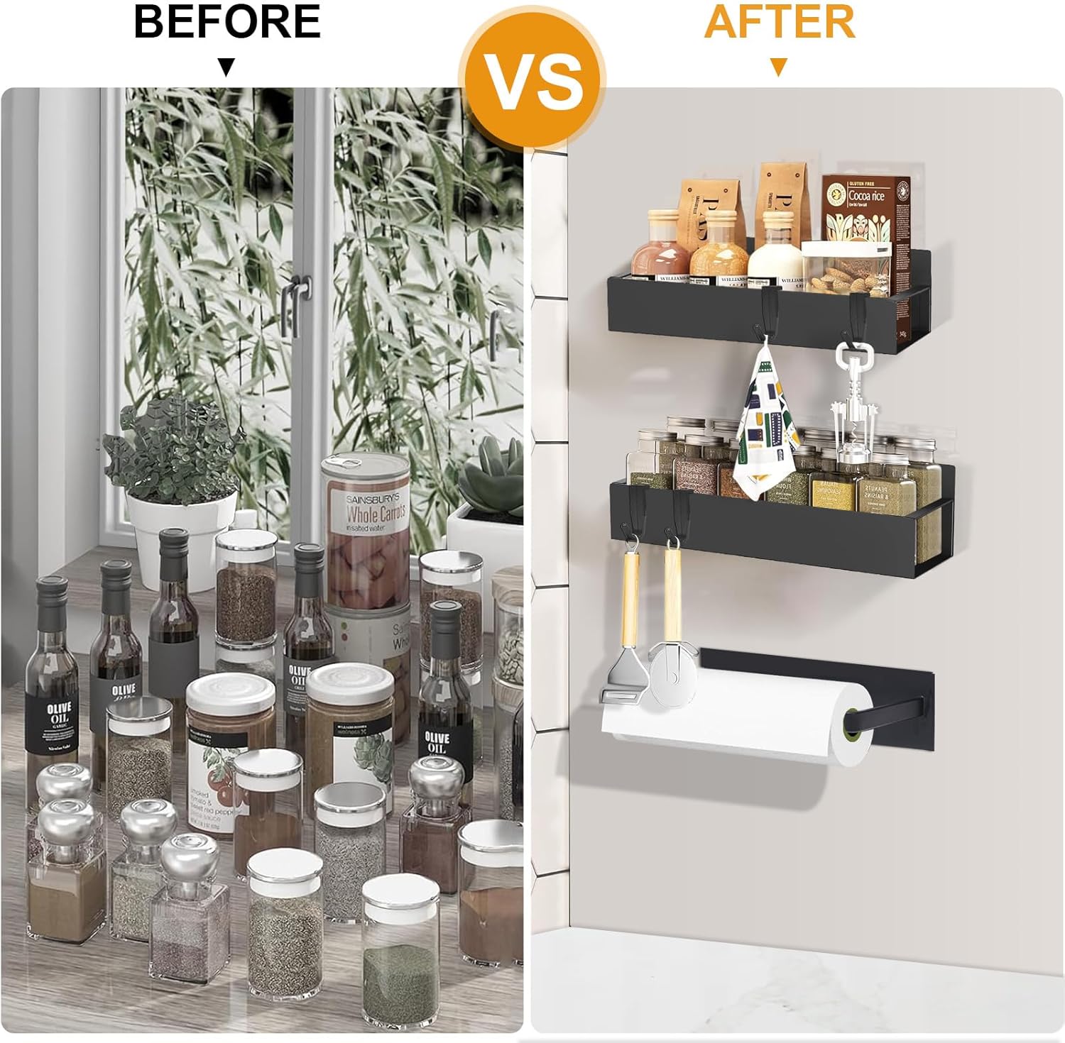 4 Pack Magnetic Spice Rack for Refrigerator,Metal Magnetic Shelf Black with Paper Towel Holder,Whiteboard,3 Markers,4 Hooks,Space Saving for Home,Kitchen