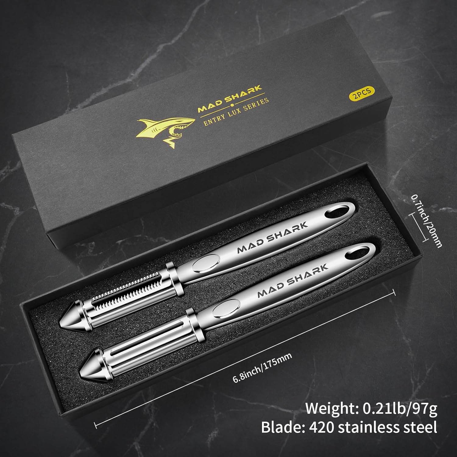 MAD SHARK Ultra Sharp Peeler,Flat/Serrated Blade 2 in 1–10 Years No-Rust,I-Shaped Stainless Steel Peelers,Vegetable Peeler with Ergonomic Non-Slip Handle,Potato Peelers for Kitchen 2pc