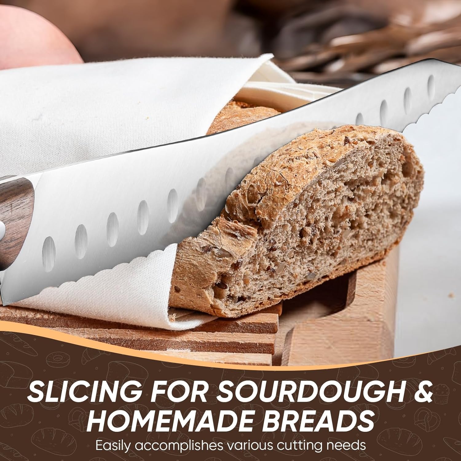 - Razor-Sharp Cutting Bread: With about 10-inch blade made from high-quality German high carbon steel, our bread knife offers exceptional durability and sharpness. Effortlessly slice through homemade bread for precise, efficient cuts every time