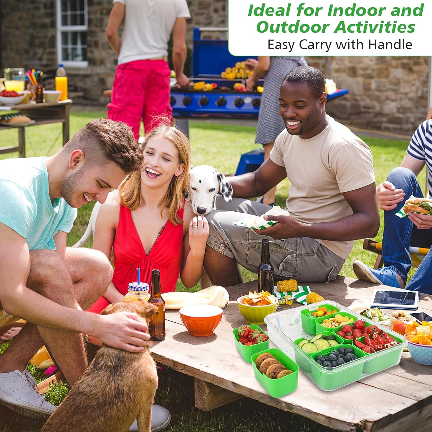 - ăPortable Charcuterie ContainerăThe divided serving tray with lid and handle is stackable for easy carry, perfect for indoor and outdoor use like gatherings, parties, kitchen use, movie night, watching ball game and beach camping, picnic and travel for portable size.