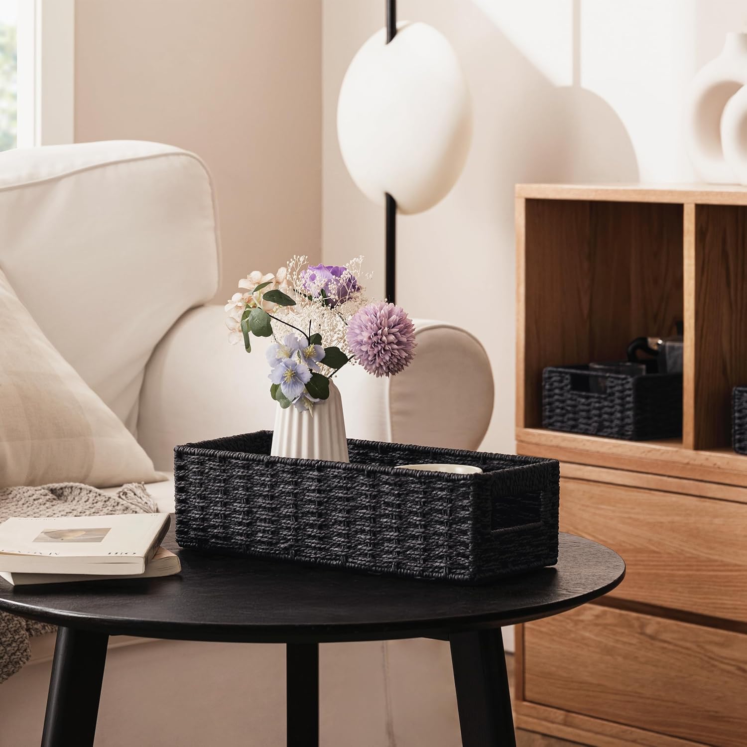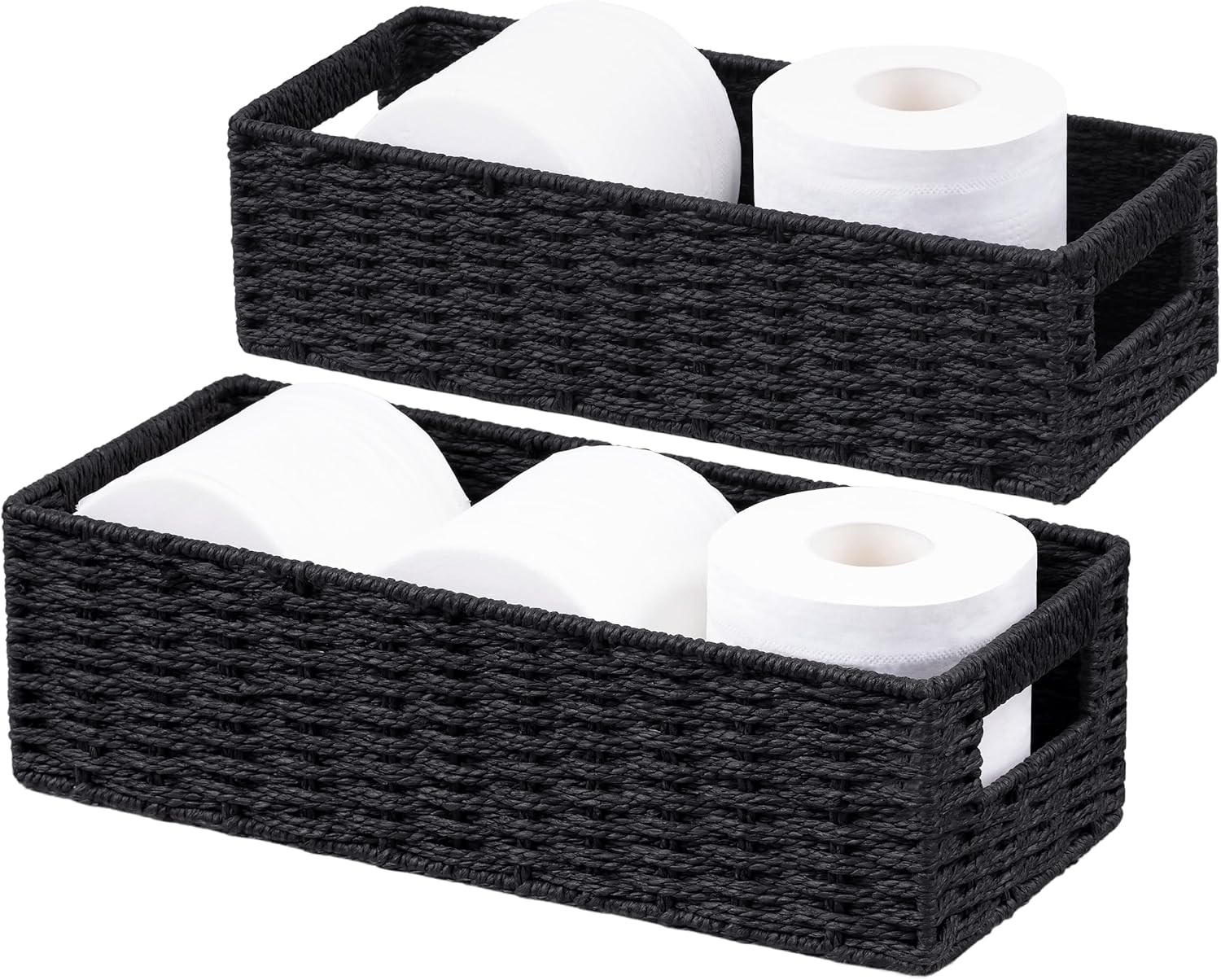 UBBCARE Toilet Tank Basket for Bathroom, Hand Woven Paper Wicker Basket for Organizing, Countertop Decorative Storage Basket with Handles, 2-Pack, Black