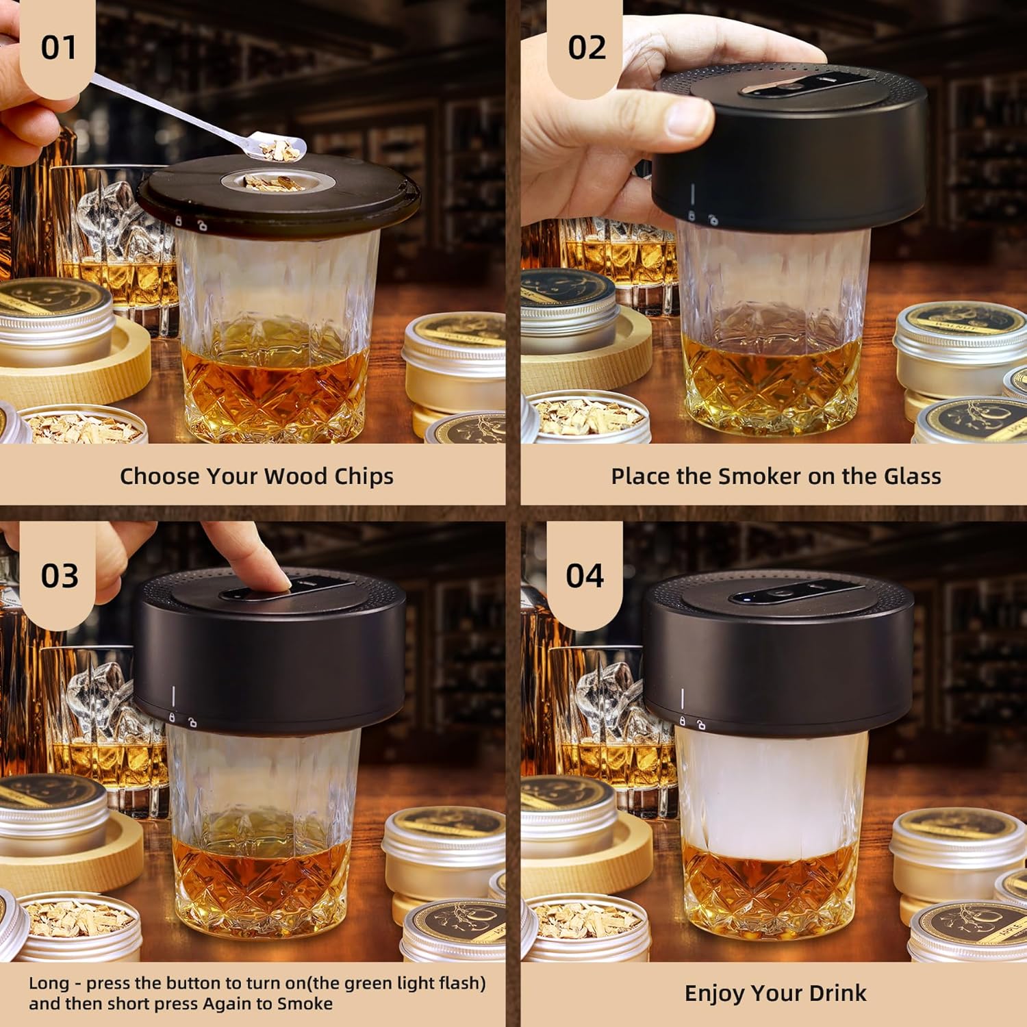 - All-in-One Drink Smoker Kit for Whiskey & Cocktails - Unleash bar—quality flair at home with our electric whiskey smoker kit—the ultimate smoke drink infuser for classic bourbon cocktails and craft drinks. Rechargeable design replaces clunky flames (no butane!), while 6 wood chips (oak/apple/pecan/cherry/pear/beech) let you customize smoky intensity in seconds.