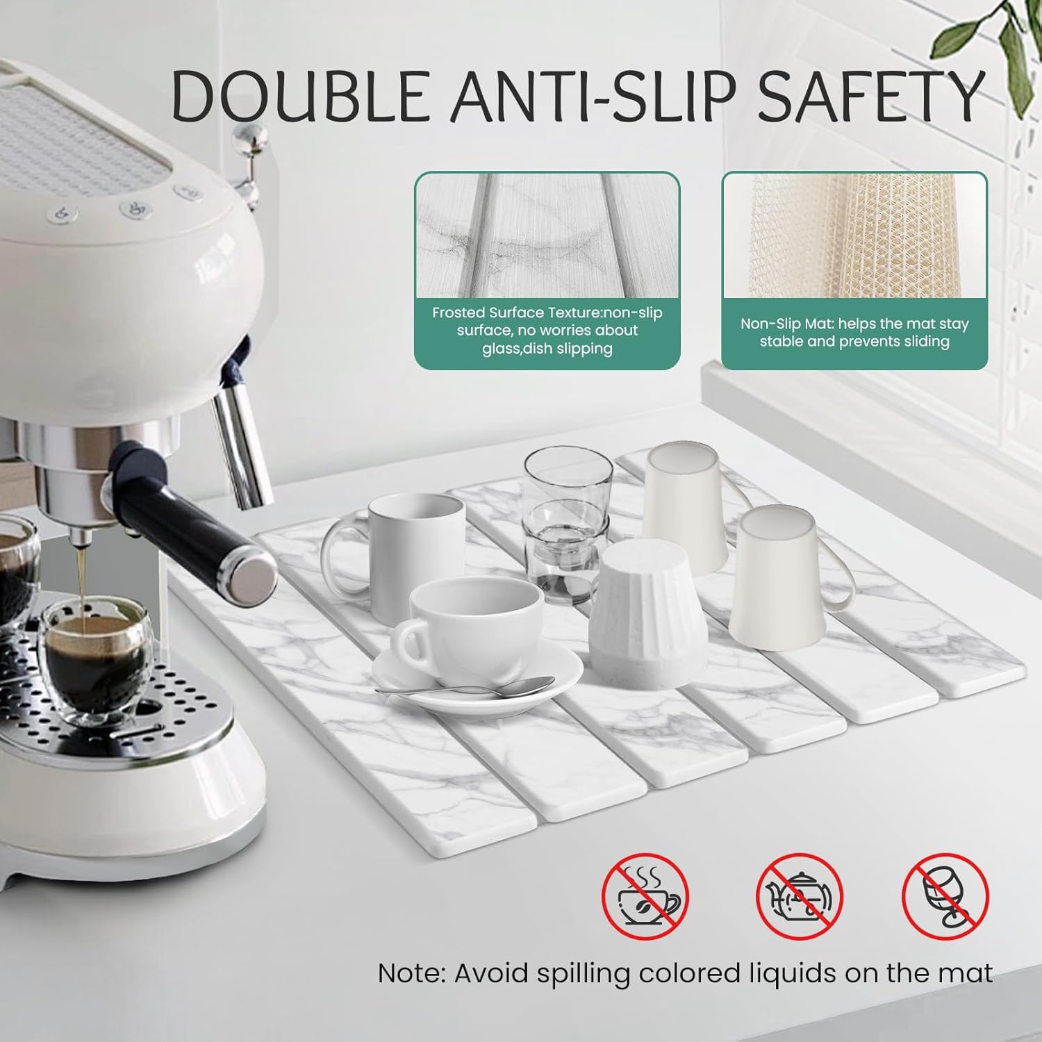 - 【Foldable&Rollable Design】:The foldable dish drying rack what we designed is foldable and rollable,efficiently helping you achieve the idea of convenient storage.When not in use,can be folded or rolled up and placed in kitchen drawers,cabinets,clothing drawers etc;when during use,its large size provides spacious space for the tableware,cookware,cups etc.It comes with PVC anti slip pad that can be used together to achieve double-sided anti slip and double safety.Our stone drying mat to enables your kitchen countertops to be clean and organized.