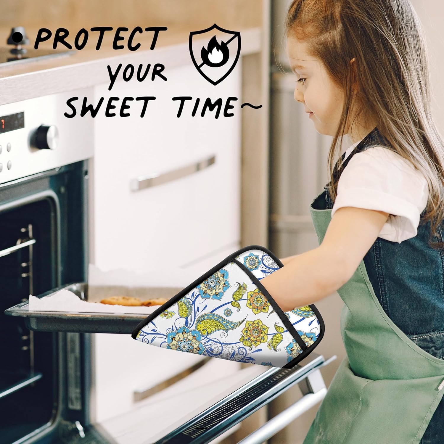 Boho Floral Oven Mitts Set, Vintage Luxury Blue and Gold Flower Floral Heat Resistant Kitchen Oven Gloves for Baking and Cooking,Pot Holders